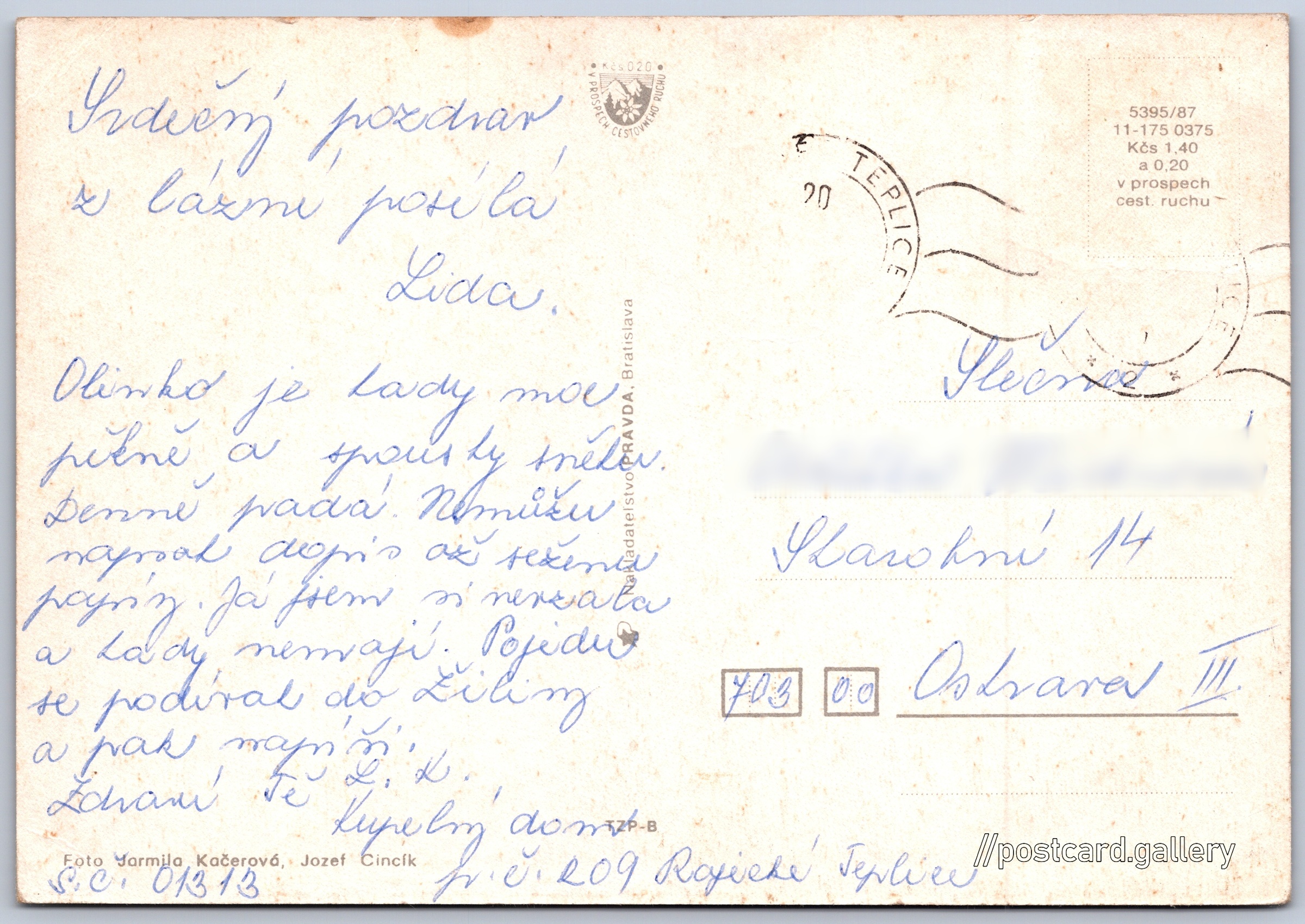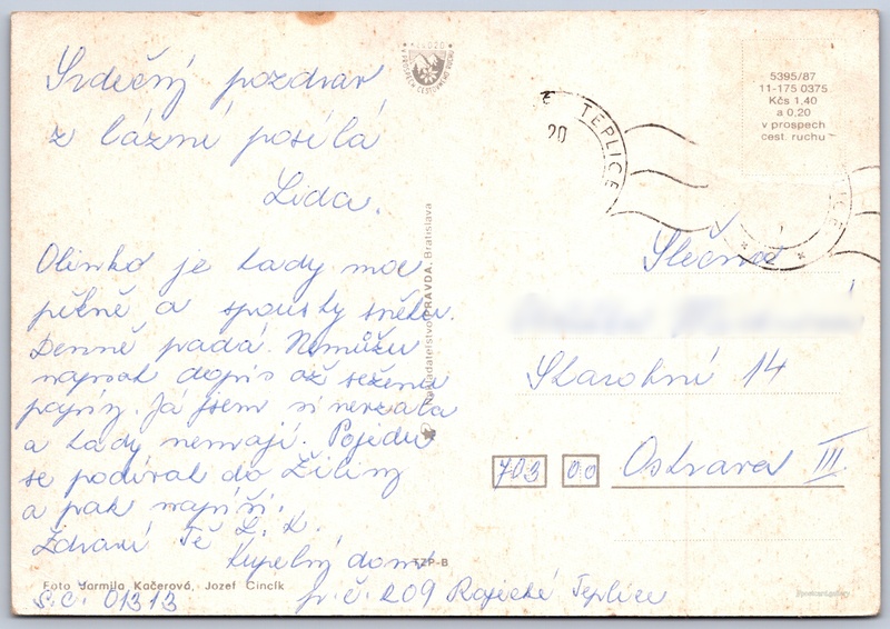Cena pohlednice: 1,40 Kčs (CSK) (+0,20 Kčs přípl. na tur. ruch)