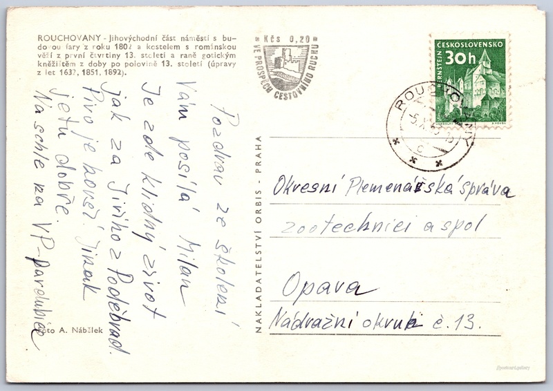 Rouchovany, náměstí 4/7 Pokud chcete vidět pohlednice ve vyšším rozlišení nebo zobrazovat jejich zadní stranu, tak se prosím nejdříve přihlašte Přihlásit Zaregistrovat ROUCHOVANY - Jihovýchodní část náměstí s budovou fary z roku 1802 a kostelem s románskou věží z první čtvrtiny 13. století a raně gotickým kněžištěm z doby po polovině 13. století (úpravy z let 1632, 1851, 1892). Jazyk tištěného textu na pohlednici: čeština Rouchovany, Třebíč ukázat na mapě V blízkém okolí místa zobrazeného na pohlednici lze najít 4 jiné pohlednice. Zobrazit blízké pohlednice Vydavatel: Nakladatelství Orbis (Československo) Odhadované datum vydání pohlednice: 1960 - 1963 Pomozte nám zpřesnit rok vzniku pohlednice Velikost (š x v) a tvar pohlednice: 147 x 102 mm (5.79" x 4.02"), obdélník Osoby spjaté s touto pohlednicí: A. Nábělek(Autor fotografie) Prošlá poštou:Datum na razítku: 5.10.1963 Ceny: Příplatek na tur. ruch: 0,20 Kčs (CSK))Vyplacené známky: 0,30 Kčs (CSK) DiskuseVložit příspěvek Přidat novou složku ... Spravovat složky ...
