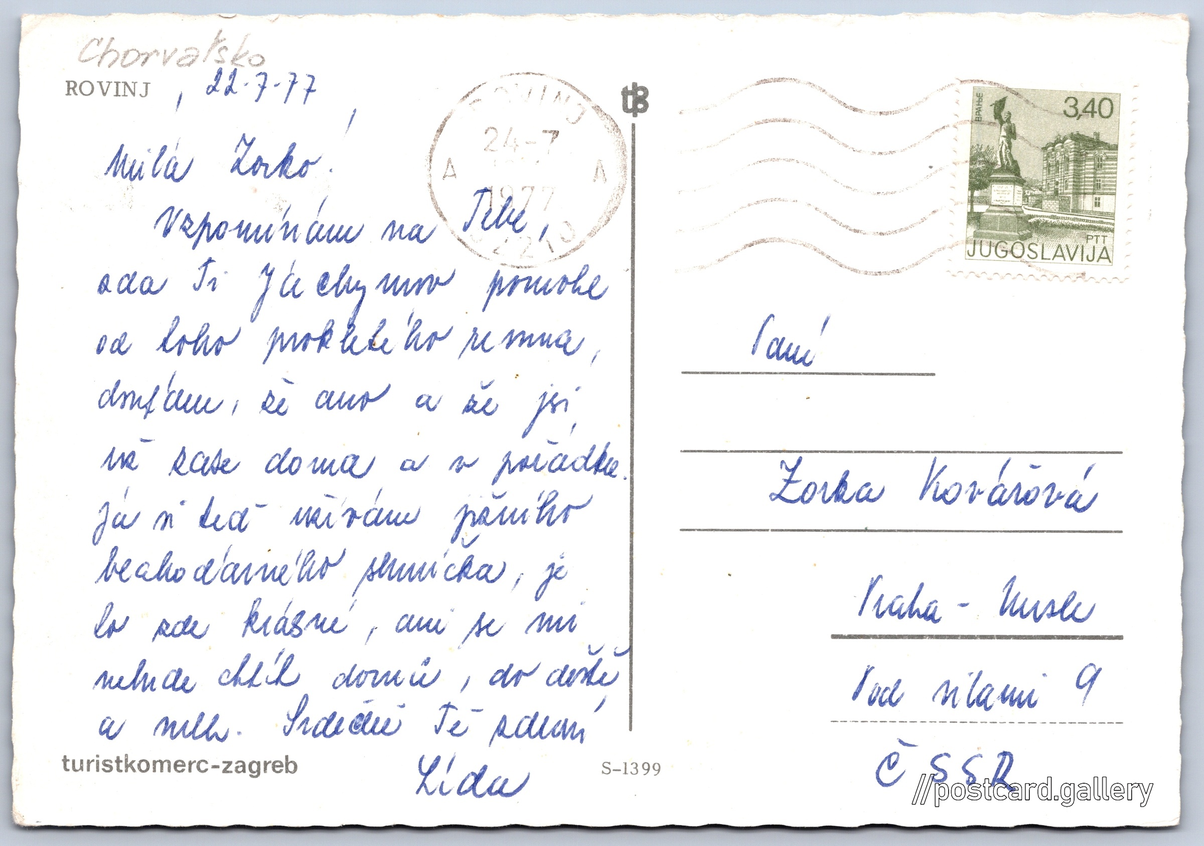 Rovinj, pohled na město Pokud chcete vidět pohlednice ve vyšším rozlišení nebo zobrazovat jejich zadní stranu, tak se prosím nejdříve přihlašte Přihlásit Zaregistrovat ROVINJ Jazyk tištěného textu na pohlednici: čeština Rovinj ukázat na mapě Vydavatel: Turistkomerc (Jugoslávie) Odhadované datum vydání pohlednice: 1974 - 1977 Pomozte nám zpřesnit rok vzniku pohlednice Velikost (š x v) a tvar pohlednice: 147 x 101 mm (5.79" x 3.98"), obdélník, zoubkovaný Prošlá poštou:Datum na razítku: 24.7.1977Datum napsání pohledu: 22.7.1977 Ceny: Vyplacené známky: 3,40 kn (HRK) Kódy na pohlednici: S-1399 DiskuseVložit příspěvek Přidat novou složku ... Spravovat složky ...