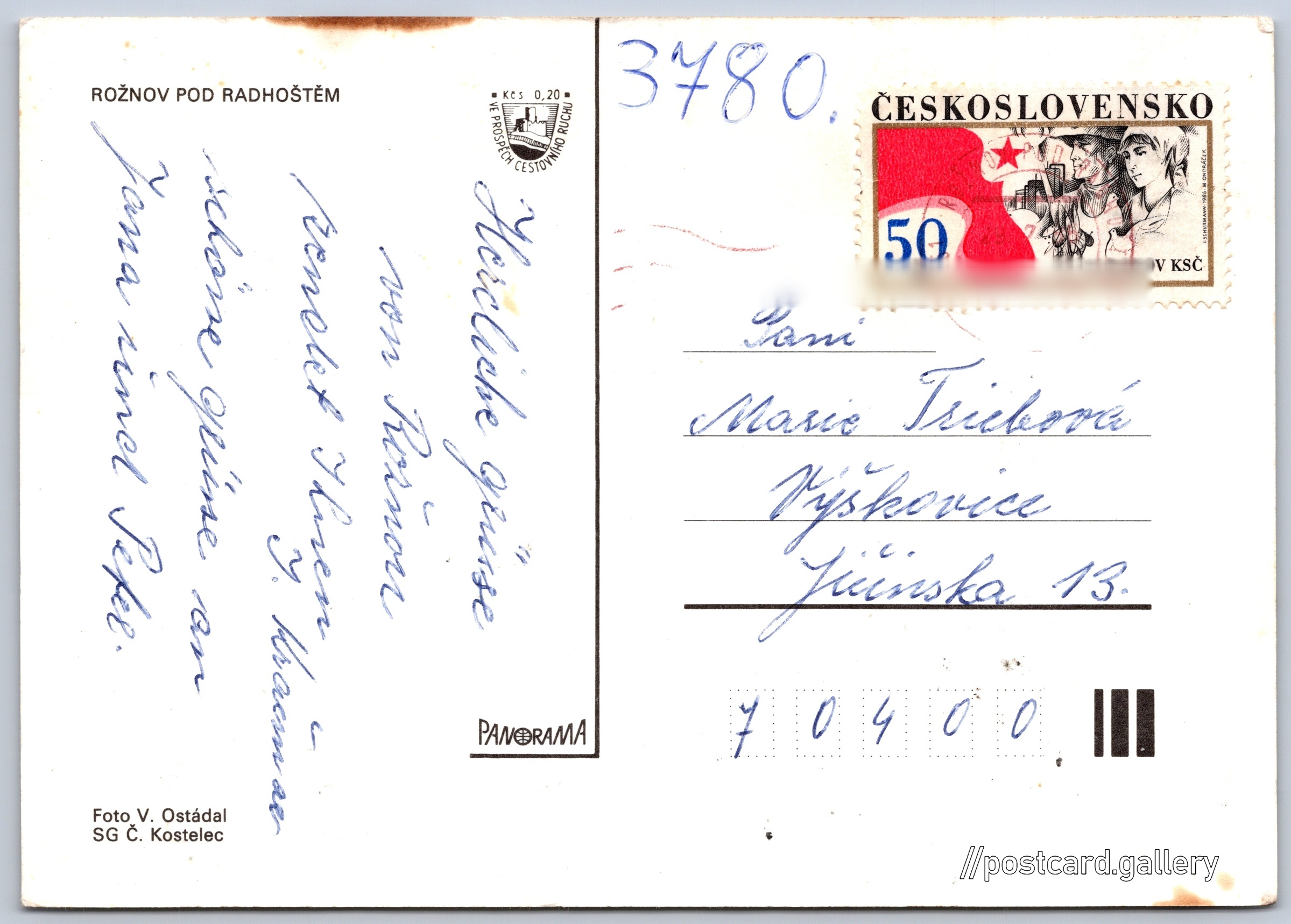 Rožnov pod Radhoštěm Pokud chcete vidět pohlednice ve vyšším rozlišení nebo zobrazovat jejich zadní stranu, tak se prosím nejdříve přihlašte Přihlásit Zaregistrovat Rožnov pod Radhoštěm ROŽNOV POD RADHOŠTĚM Jazyk tištěného textu na pohlednici: čeština Rožnov pod Radhoštěm, Město, Česko ukázat na mapě Vydavatel: Panorama (Československo) Odhadované datum vydání pohlednice: 1982 - 1985 Pomozte nám zpřesnit rok vzniku pohlednice Velikost (š x v) a tvar pohlednice: 148 x 105 mm (5.83" x 4.13"), obdélník Osoby spjaté s touto pohlednicí: Václav Ostádal(Autor fotografie) Prošlá poštou:Datum na razítku: 29.7.1985 Ceny: Příplatek na tur. ruch: 0,20 Kčs (CSK))Vyplacené známky: 0,50 Kčs (CSK) DiskuseVložit příspěvek Přidat novou složku ... Spravovat složky ...