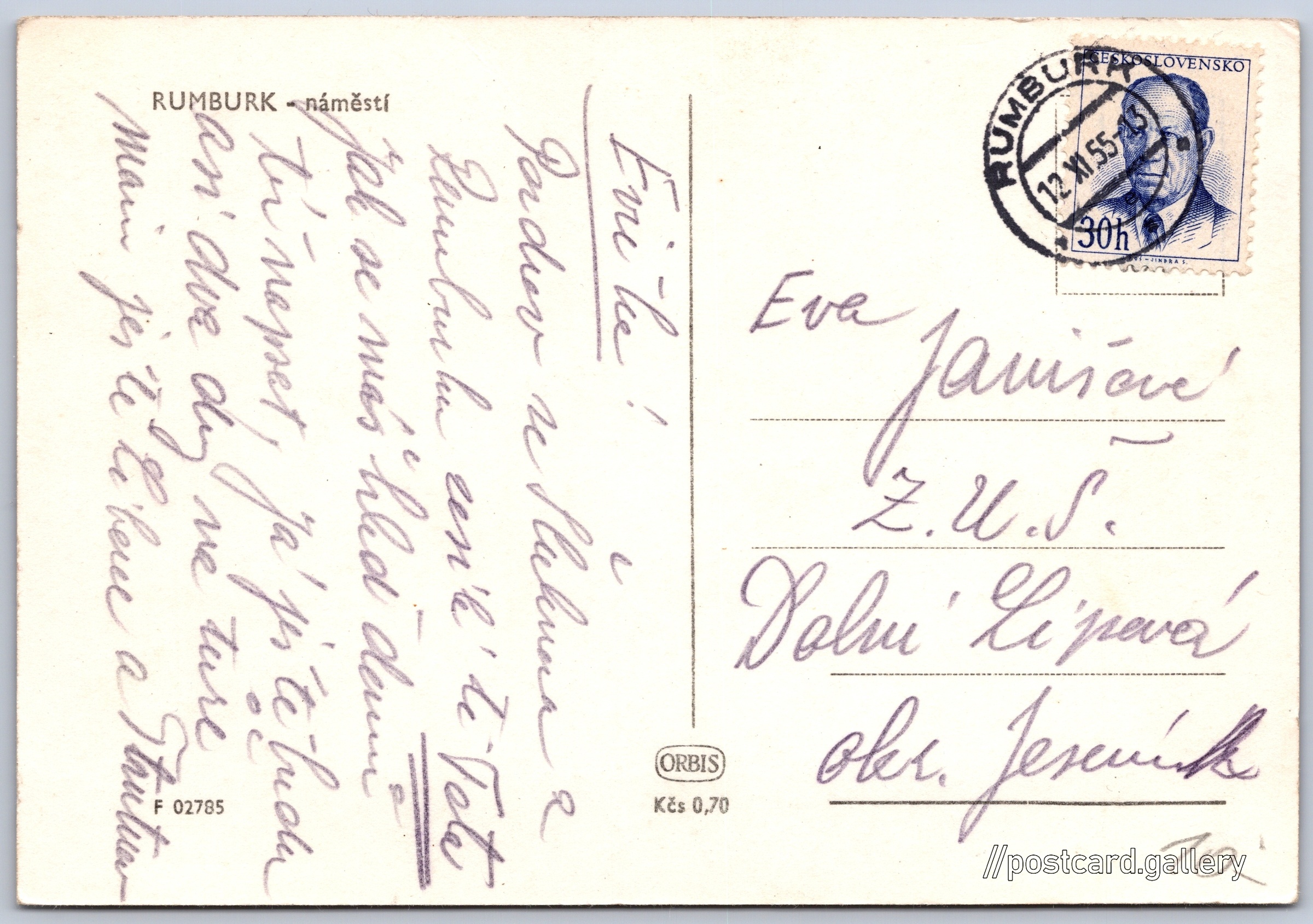 Rumburk, náměstí Pokud chcete vidět pohlednice ve vyšším rozlišení nebo zobrazovat jejich zadní stranu, tak se prosím nejdříve přihlašte Přihlásit Zaregistrovat RUMBURK - náměstí Jazyk tištěného textu na pohlednici: angličtina Náměstí Lužické 388/3a, Rumburk, 408 01, Děčín ukázat na mapě V blízkém okolí místa zobrazeného na pohlednici lze najít 3 jiné pohlednice. Zobrazit blízké pohlednice Vydavatel: Nakladatelství Orbis (Československo) Odhadované datum vydání pohlednice: 1952 - 1955 Pomozte nám zpřesnit rok vzniku pohlednice Velikost (š x v) a tvar pohlednice: 146 x 101 mm (5.75" x 3.98"), obdélník Prošlá poštou:Datum na razítku: 12.11.1955 Ceny: Cena pohlednice: 0,70 Kčs (CSK)Vyplacené známky: 0,30 Kčs (CSK) Kódy na pohlednici: F 02785 DiskuseVložit příspěvek Přidat novou složku ... Spravovat složky ...