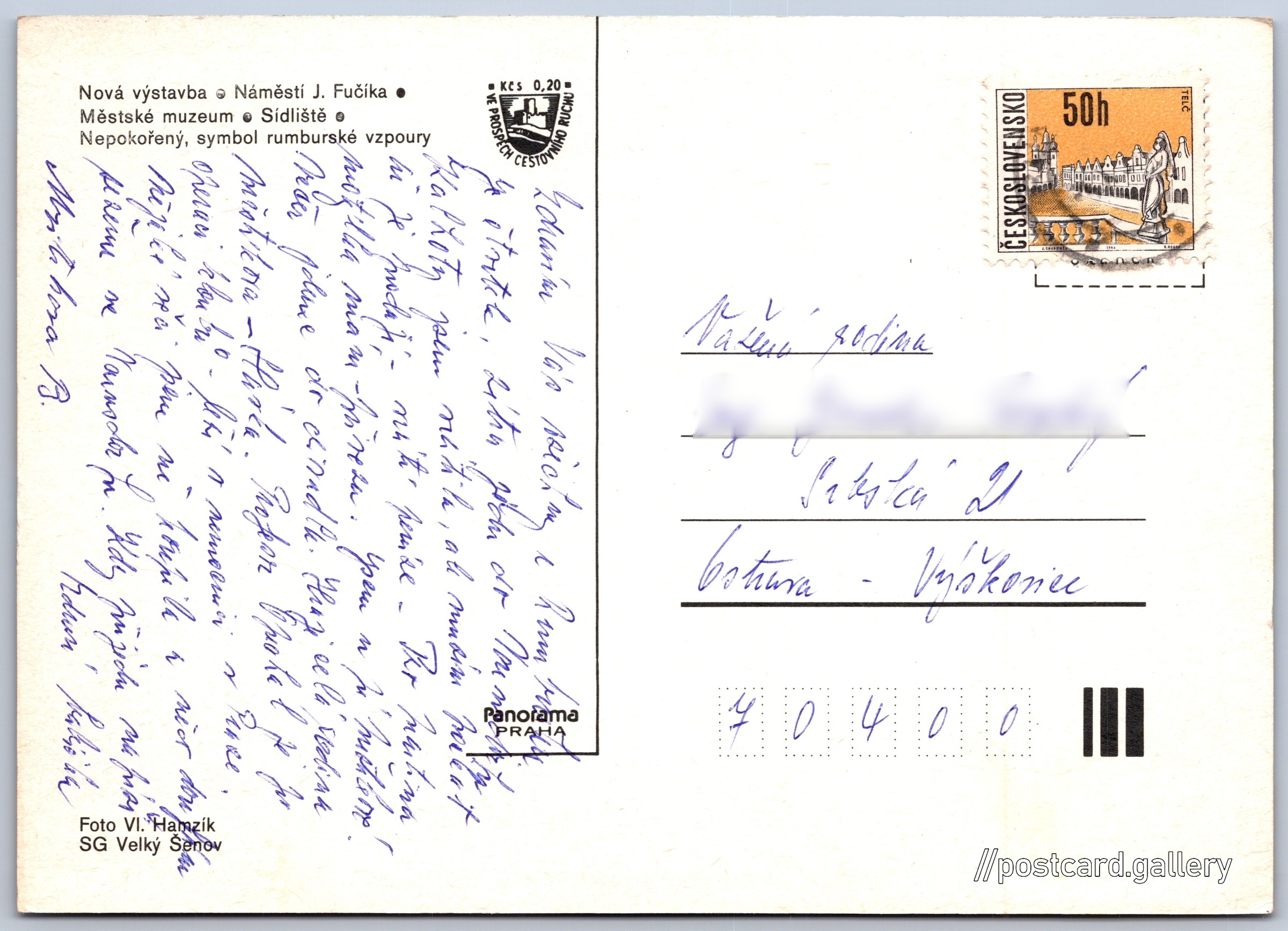 Rumburk Pokud chcete vidět pohlednice ve vyšším rozlišení nebo zobrazovat jejich zadní stranu, tak se prosím nejdříve přihlašte Přihlásit Zaregistrovat Rumburk - Nová výstavba- Náměstí J. Fučíka- Městské muzeum- Sídliště- Nepokořený, symbol rumburské vzpoury Jazyk tištěného textu na pohlednici: čeština Slovenského nár. povstání 125/5, Rumburk, 408 01, Děčín ukázat na mapě Vydavatel: Panorama (Československo) Datum vydání není známo Pomozte nám odhadnout datum vzniku pohlednice Velikost (š x v) a tvar pohlednice: 148 x 105 mm (5.83" x 4.13"), obdélník Osoby spjaté s touto pohlednicí: Julius Fučík(Jméno v názvu místa) Vl. Hamzík(Autor fotografie) Vendelín Zdrůbecký(Obsah pohlednice) Prošlá poštou Ceny: Příplatek na tur. ruch: 0,20 Kčs (CSK))Vyplacené známky: 0,50 Kčs (CSK) DiskuseVložit příspěvek Přidat novou složku ... Spravovat složky ...