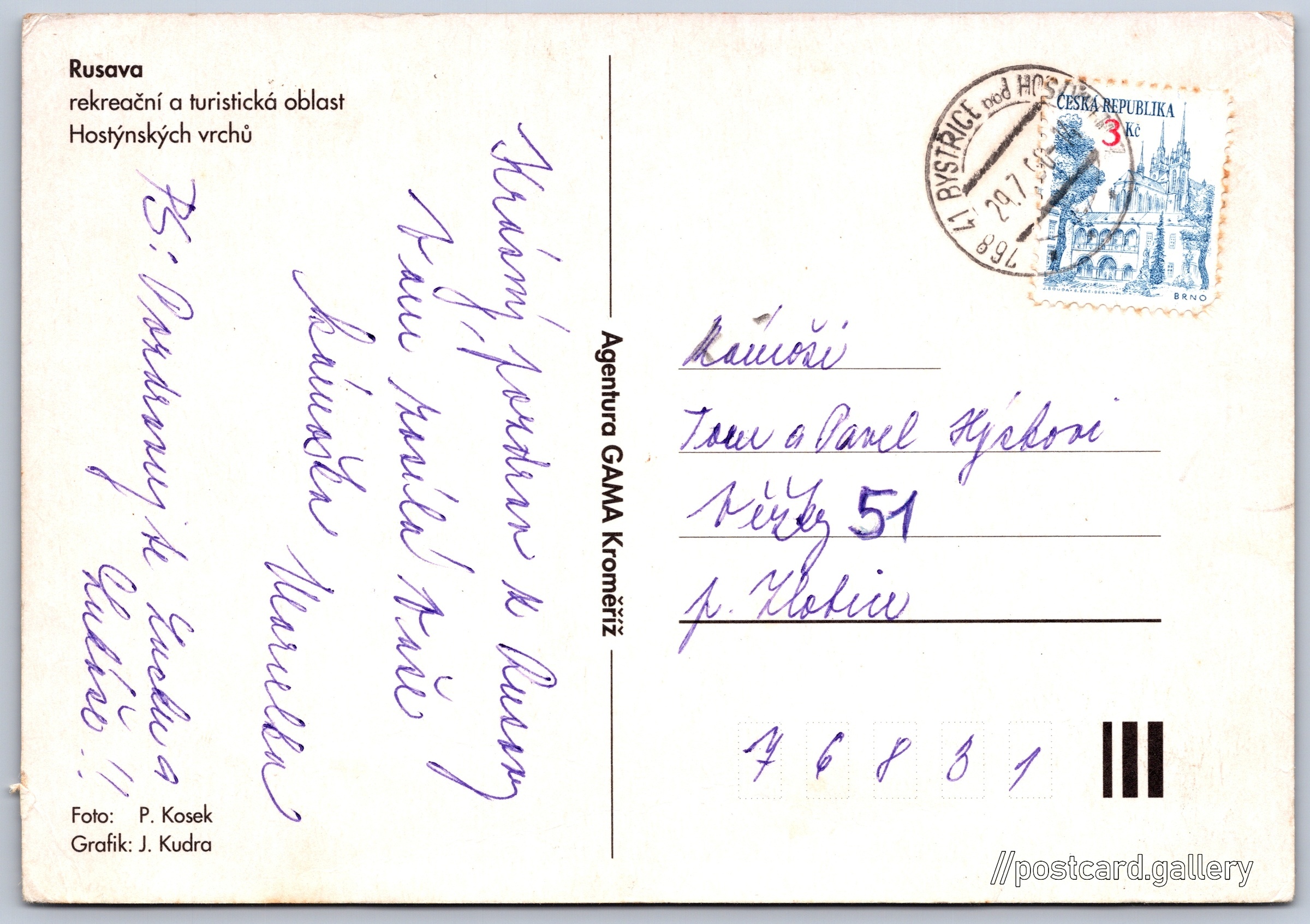 Rusava Pokud chcete vidět pohlednice ve vyšším rozlišení nebo zobrazovat jejich zadní stranu, tak se prosím nejdříve přihlašte Přihlásit Zaregistrovat Rusava Rusavarekreační a turistická oblast Hostýnských vrchů Jazyk tištěného textu na pohlednici: čeština Rusava, Kroměříž ukázat na mapě V blízkém okolí místa zobrazeného na pohlednici lze najít 15 jiných pohlednic. Zobrazit blízké pohlednice Vydavatel: Agentura Gama (Česko) Odhadované datum vydání pohlednice: 1997 - 2000 Pomozte nám zpřesnit rok vzniku pohlednice Velikost (š x v) a tvar pohlednice: 151 x 105 mm (5.94" x 4.13"), obdélník Osoby spjaté s touto pohlednicí: Pavel Kosek(Autor fotografie) J. Kudra(Design pohlednice) Prošlá poštou:Datum na razítku: 29.7.2000 Ceny: Vyplacené známky: 3,00 Kč (CZK) DiskuseVložit příspěvek Přidat novou složku ... Spravovat složky ...