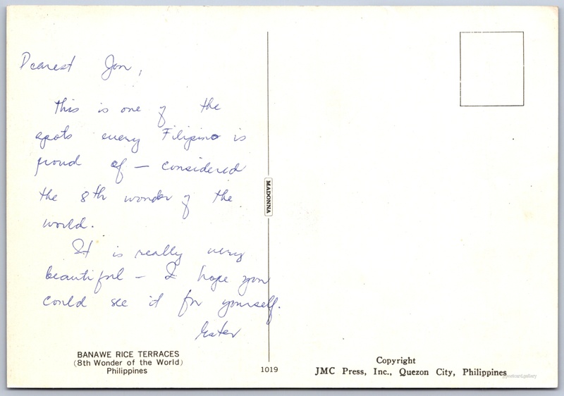 Rýžové terasy Banawe Pokud chcete vidět pohlednice ve vyšším rozlišení nebo zobrazovat jejich zadní stranu, tak se prosím nejdříve přihlašte Přihlásit Zaregistrovat BANAWE RICE TERRACES(8th Wonder of the World)Philippines Jazyk tištěného textu na pohlednici: angličtina Banaue Rice Terraces, Chráněná oblast, Banaue, Filipíny ukázat na mapě Vydavatel: Madonna (Filipíny) Datum vydání není známo Pomozte nám odhadnout datum vzniku pohlednice Velikost (š x v) a tvar pohlednice: 146 x 100 mm (5.75" x 3.94"), obdélník Prošlá poštou Kódy na pohlednici: 1019 DiskuseVložit příspěvek Přidat novou složku ... Spravovat složky ...
