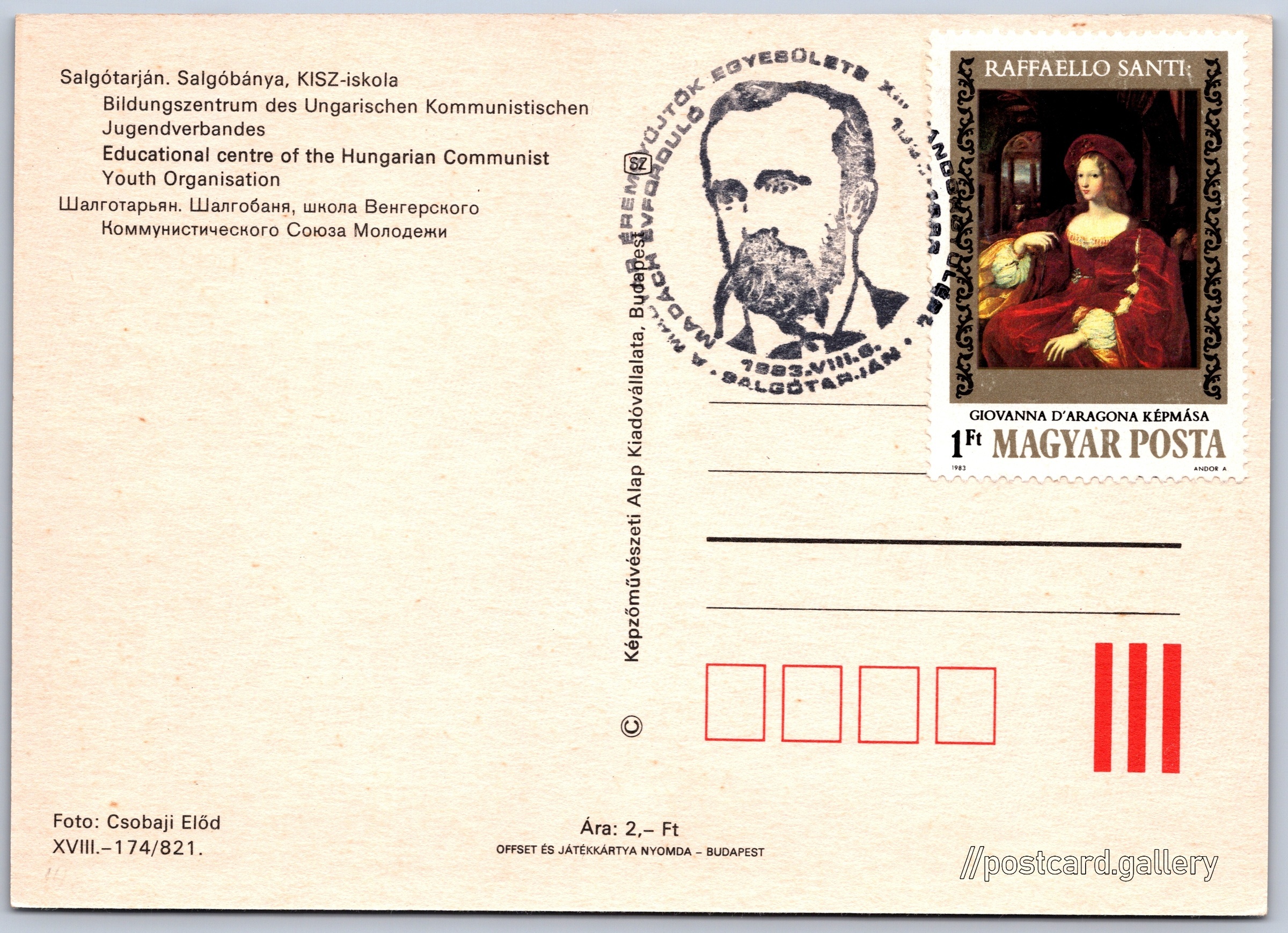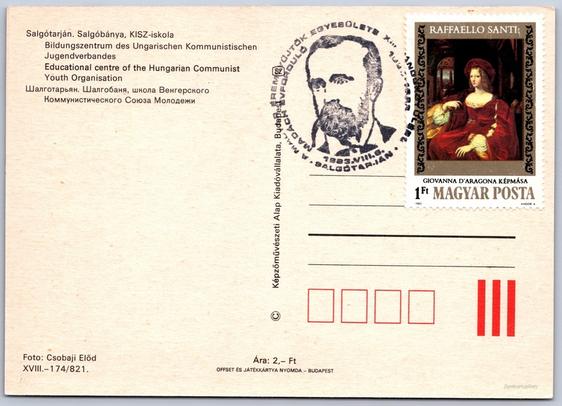 Salgótarján, výukové centrum Pokud chcete vidět pohlednice ve vyšším rozlišení nebo zobrazovat jejich zadní stranu, tak se prosím nejdříve přihlašte Přihlásit Zaregistrovat Salgótarján. Salgóbánya, KISZ-iskola- Bildungszentrum des Ungarischen Kommunistischen Jugendverbandes- Educational centre of the Hungarian Communist Youth OrganisationШалготарьян. Шалгобаня, школа Венгерского- Коммунистического Союза Молодежи Jazyk tištěného textu na pohlednici: maďarština Salgóbánya, Sídliště, čtvrť, Great Plain and North, Maďarsko ukázat na mapě Přesné místo není známo. Pokud jej znáte, tak jej prosím napište do komentářů nebo označte na mapě Odhadované datum vydání pohlednice: 1982 - 1983 Pomozte nám zpřesnit rok vzniku pohlednice Velikost (š x v) a tvar pohlednice: 146 x 104 mm (5.75" x 4.09"), obdélník Osoby spjaté s touto pohlednicí: Előd Csobaji(Autor fotografie) Čistá pohlednice (neprošlá poštou) Ceny: Cena pohlednice: 2 Ft (HUF)Vyplacené známky: 1 Ft (HUF) Kódy na pohlednici: XVIII.-174/821 DiskuseVložit příspěvek Přidat novou složku ... Spravovat složky ...