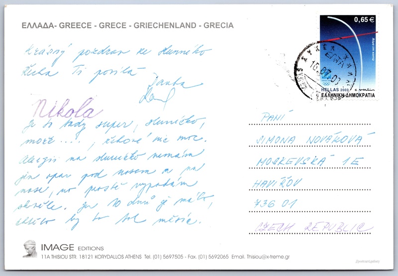 Sarti Chalkidiki Pokud chcete vidět pohlednice ve vyšším rozlišení nebo zobrazovat jejich zadní stranu, tak se prosím nejdříve přihlašte Přihlásit Zaregistrovat Sarti Chalkidiki GREECE - GRECE - GRIECHENLAND - GRECIA Jazyk tištěného textu na pohlednici: řečtina Sarti, Greece (Σάρτη Χαλκιδικής), Vesnice, Řecko ukázat na mapě Odhadované datum vydání pohlednice: 2000 - 2003 Pomozte nám zpřesnit rok vzniku pohlednice Velikost (š x v) a tvar pohlednice: 160 x 109 mm (6.30" x 4.29"), obdélník Prošlá poštou:Datum na razítku: 10.7.2003 Ceny: Vyplacené známky: 0,65 € (EUR) DiskuseVložit příspěvek Přidat novou složku ... Spravovat složky ...
