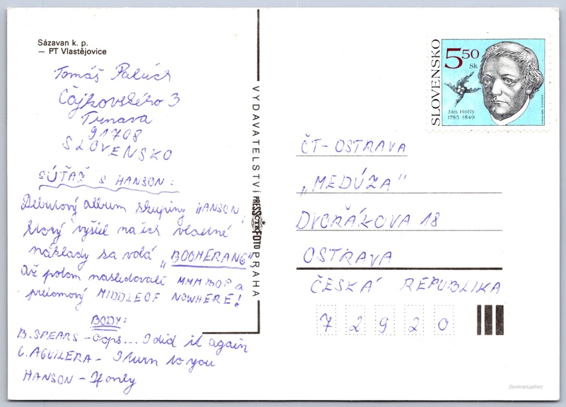 Sázavan, pionýrský tábor Vlastějovice Pokud chcete vidět pohlednice ve vyšším rozlišení nebo zobrazovat jejich zadní stranu, tak se prosím nejdříve přihlašte Přihlásit Zaregistrovat Sázavan k. p. - PT Vlastějovice Jazyk tištěného textu na pohlednici: čeština Kounice ev. č. 242, Vlastějovice, 285 22, Kutná Hora ukázat na mapě Vydavatel: PressFoto Praha (Československo) Odhadované datum vydání pohlednice: 1998 - 2001 Pomozte nám zpřesnit rok vzniku pohlednice Velikost (š x v) a tvar pohlednice: 147 x 105 mm (5.79" x 4.13"), obdélník Prošlá poštou Ceny: Vyplacené známky: 5,50 Sk (SKK) DiskuseVložit příspěvek Přidat novou složku ... Spravovat složky ...