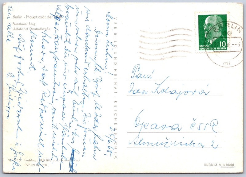 sdfsdf Pokud chcete vidět pohlednice ve vyšším rozlišení nebo zobrazovat jejich zadní stranu, tak se prosím nejdříve přihlašte Přihlásit Zaregistrovat Berlin - Hauptstadt der DDRPrenzlauer BergU-Bahnhof Dimitroffstrasse Jazyk tištěného textu na pohlednici: němčina Danziger Straße ukázat na mapě V blízkém okolí místa zobrazeného na pohlednici lze najít 3 jiné pohlednice. Zobrazit blízké pohlednice Vydavatel: Bild und Heimat (Německo) Odhadované datum vydání pohlednice: 1965 - 1968 Pomozte nám zpřesnit rok vzniku pohlednice Velikost (š x v) a tvar pohlednice: 148 x 105 mm (5.83" x 4.13"), obdélník Prošlá poštou:Datum na razítku: 27.6.1968Datum napsání pohledu: 25.6.1968 Ceny: Cena pohlednice: 0,20 M (MDN)Vyplacené známky: 0,10 M (MDN) Kódy na pohlednici: 6115 III/26/13 A 1/46/66 DiskuseVložit příspěvek Přidat novou složku ... Spravovat složky ...