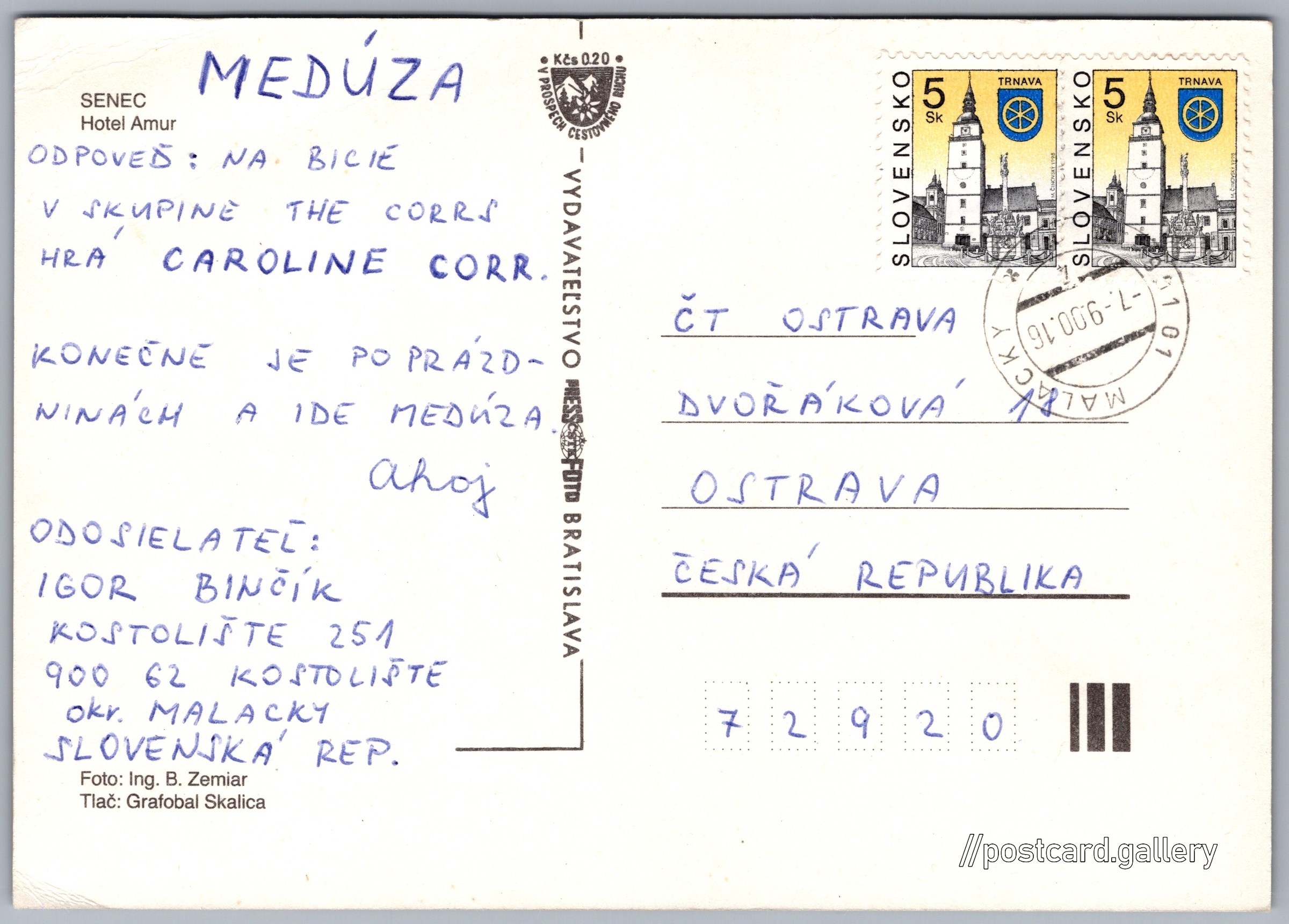 Senec, hotel Amur Pokud chcete vidět pohlednice ve vyšším rozlišení nebo zobrazovat jejich zadní stranu, tak se prosím nejdříve přihlašte Přihlásit Zaregistrovat Senec SENECHotel Amur Jazyk tištěného textu na pohlednici: slovenština Apartmánový Wellness Garni Hotel Relax, Slnečné jazerá - Sever 2601, Senec, Okres Senec, Bratislavský kraj, Slovensko ukázat na mapě V blízkém okolí místa zobrazeného na pohlednici lze najít 2 jiné pohlednice. Zobrazit blízké pohlednice Vydavatel: PressFoto Bratislava (Československo) Odhadované datum vydání pohlednice: 1997 - 2000 Pomozte nám zpřesnit rok vzniku pohlednice Velikost (š x v) a tvar pohlednice: 149 x 105 mm (5.87" x 4.13"), obdélník Osoby spjaté s touto pohlednicí: Bohuslav Zemiar(Autor fotografie) Prošlá poštou:Datum na razítku: 7.9.2000 Ceny: Příplatek na tur. ruch: 0,20 Kčs (CSK))Vyplacené známky: 10,00 Sk (SKK) DiskuseVložit příspěvek Přidat novou složku ... Spravovat složky ...