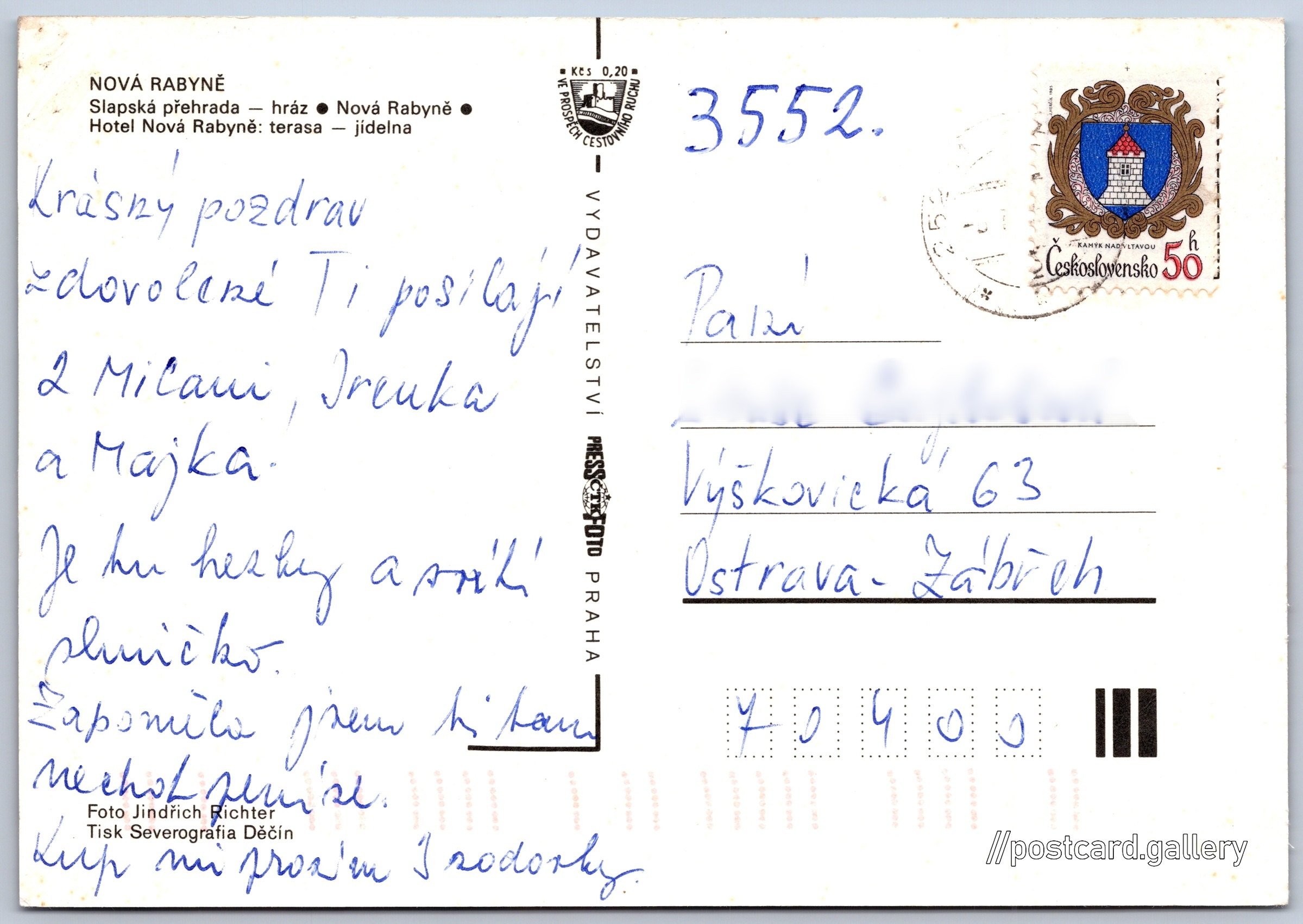 Slapská přehrada, Nová Rabyně Pokud chcete vidět pohlednice ve vyšším rozlišení nebo zobrazovat jejich zadní stranu, tak se prosím nejdříve přihlašte Přihlásit Zaregistrovat Slapská přehrada - Nová Rabyně NOVÁ RABYNĚ- Slapská přehrada - hráz- Nová Rabyně- Hotel Nová Rabyně: terasa - jídelna Jazyk tištěného textu na pohlednici: čeština Rabyně, Benešov ukázat na mapě Vydavatel: PressFoto Praha (Československo) Datum vydání není známo Pomozte nám odhadnout datum vzniku pohlednice Velikost (š x v) a tvar pohlednice: 149 x 103 mm (5.87" x 4.06"), obdélník Osoby spjaté s touto pohlednicí: Jindřich Richter(Autor fotografie) Prošlá poštou Ceny: Příplatek na tur. ruch: 0,20 Kčs (CSK))Vyplacené známky: 0,50 Kčs (CSK) DiskuseVložit příspěvek Přidat novou složku ... Spravovat složky ...
