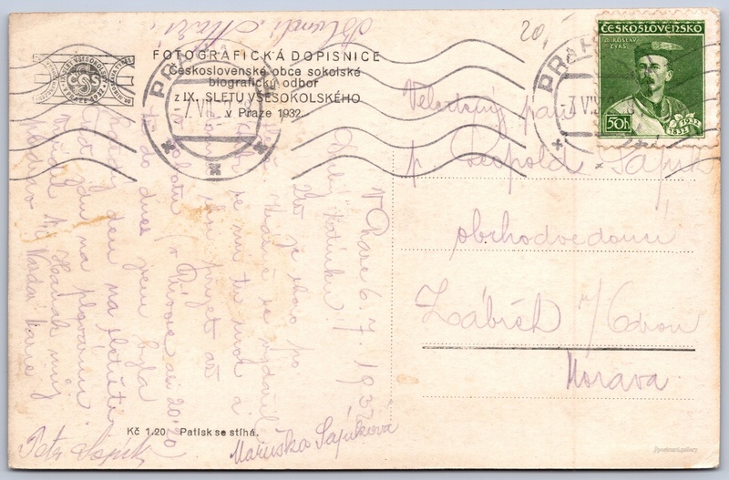 Sletová hra, Tyršův sen, závody trig Pokud chcete vidět pohlednice ve vyšším rozlišení nebo zobrazovat jejich zadní stranu, tak se prosím nejdříve přihlašte Přihlásit Zaregistrovat SLETOVÁ HRA - TYRŠŮV SEN.Hod Olympický závody trig. IX. SLET VŠESOKOLSKÝ V PRAZE 1932VÝROČÍ NAROZENÍ DR. MIROSLAVA TYRŠEFOTOGRAFICKÁ DOPISNICEČeskoslovenské obce sokolskébiografický odborz IX. SLETU VSESOKOLSKÉHO v Praze 1932. Jazyk tištěného textu na pohlednici: čeština Strahovský stadion, Technická památka, Praha - Břevnov, Česko ukázat na mapě Vydavatel: Československá obec sokolská (Československo) Rok vydání pohlednice: 1932 Velikost (š x v) a tvar pohlednice: 139 x 91 mm (5.47" x 3.58"), obdélník Osoby spjaté s touto pohlednicí: Dr. Miroslav Tyrš(Obsah pohlednice) Prošlá poštou:Datum na razítku: 7.7.1932Datum napsání pohledu: 6.7.1932 Ceny: Cena pohlednice: 1,20 Kčs (CSK)Vyplacené známky: 0,50 Kčs (CSK) Kódy na pohlednici: 39 DiskuseVložit příspěvek Přidat novou složku ... Spravovat složky ...