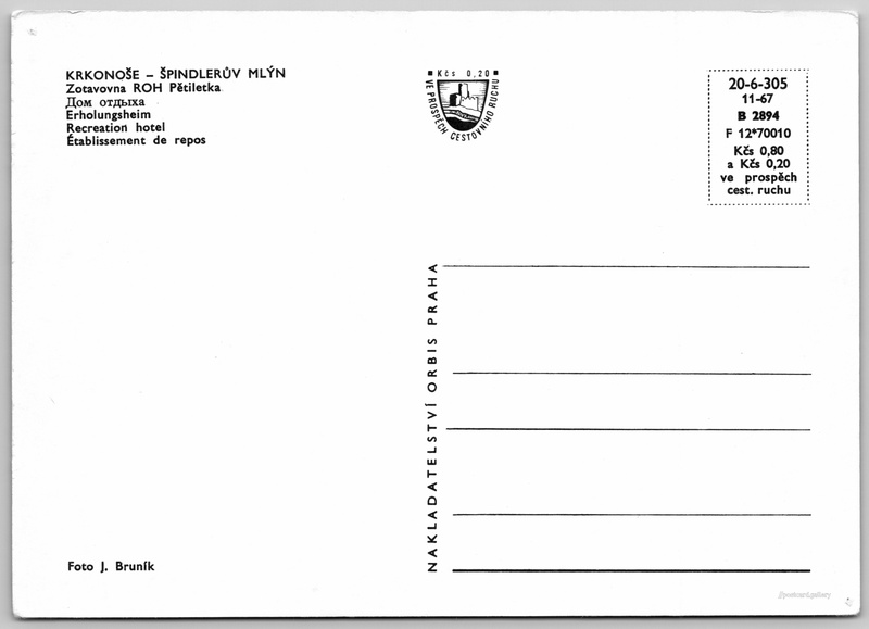 Špindlerův Mlýn, zotavovna "Pětiletka" Pokud chcete vidět pohlednice ve vyšším rozlišení nebo zobrazovat jejich zadní stranu, tak se prosím nejdříve přihlašte Přihlásit Zaregistrovat KRKONOŠE - ŠPINDLERŮV MLÝN- Zotavovna ROH Pětiletka- Дом отдыха- Erholungsheim- Recreation hotel- Établissement de repos Jazyky tištěného textu na pohlednici: čeština, ruština, němčina, angličtina, francouzština Špindlerův Mlýn 10, Špindlerův Mlýn, 543 51, Trutnov ukázat na mapě Vydavatel: Nakladatelství Orbis (Československo) Rok vydání pohlednice: listopad, 1967 Velikost (š x v) a tvar pohlednice: 147 x 105 mm (5.79" x 4.13"), obdélník Osoby spjaté s touto pohlednicí: Jiří Bruník(Autor fotografie) Čistá pohlednice (neprošlá poštou) Ceny: Cena pohlednice: 0,80 Kčs (CSK) (+0,20 Kčs přípl. na tur. ruch) Kódy na pohlednici: 20-6-305 11-67 B 2894 F 12*70010 DiskuseVložit příspěvek Přidat novou složku ... Spravovat složky ...