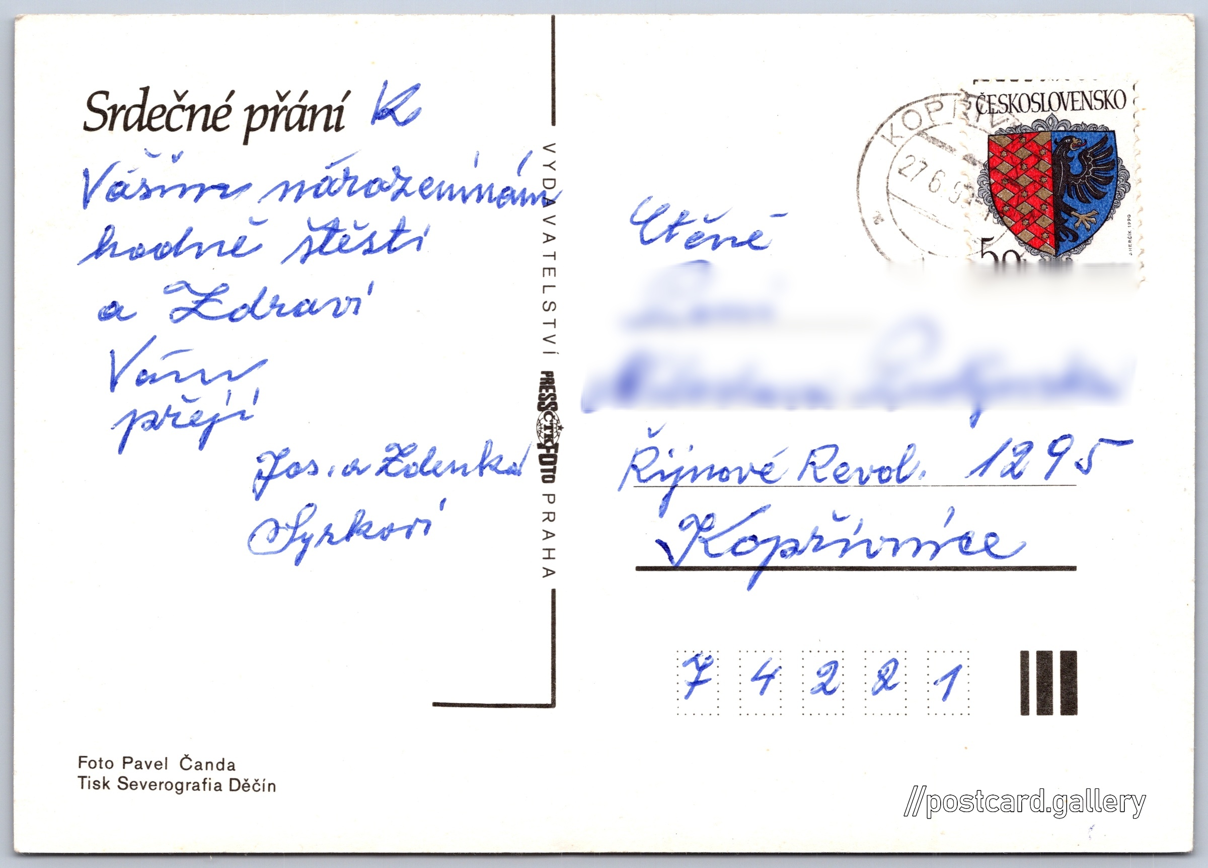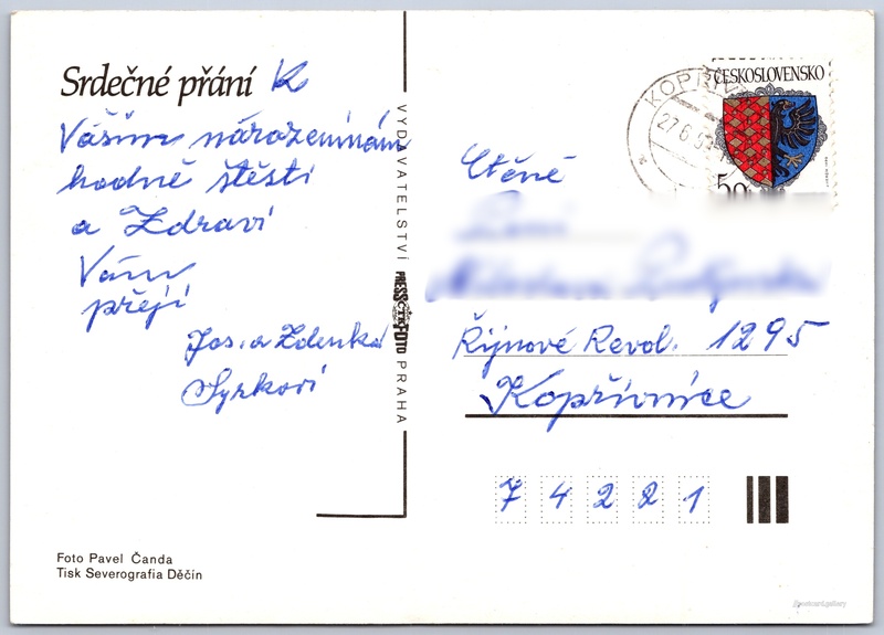Srdečné přání, květiny Pokud chcete vidět pohlednice ve vyšším rozlišení nebo zobrazovat jejich zadní stranu, tak se prosím nejdříve přihlašte Přihlásit Zaregistrovat Srdečné přání Jazyk tištěného textu na pohlednici: čeština Vydavatel: PressFoto Praha (Československo) Odhadované datum vydání pohlednice: 1987 - 1990 Pomozte nám zpřesnit rok vzniku pohlednice Velikost (š x v) a tvar pohlednice: 148 x 105 mm (5.83" x 4.13"), obdélník Osoby spjaté s touto pohlednicí: Pavel Čanda(Autor fotografie) Prošlá poštou:Datum na razítku: 27.6.1990 Ceny: Vyplacené známky: 0,50 Kčs (CSK) DiskuseVložit příspěvek Přidat novou složku ... Spravovat složky ...