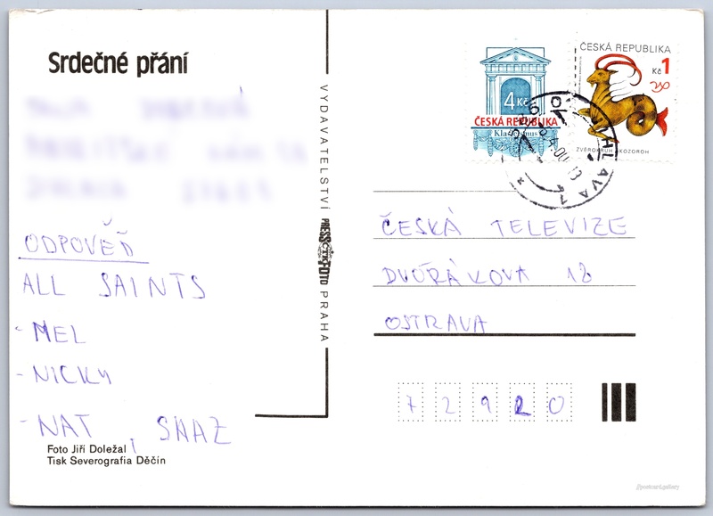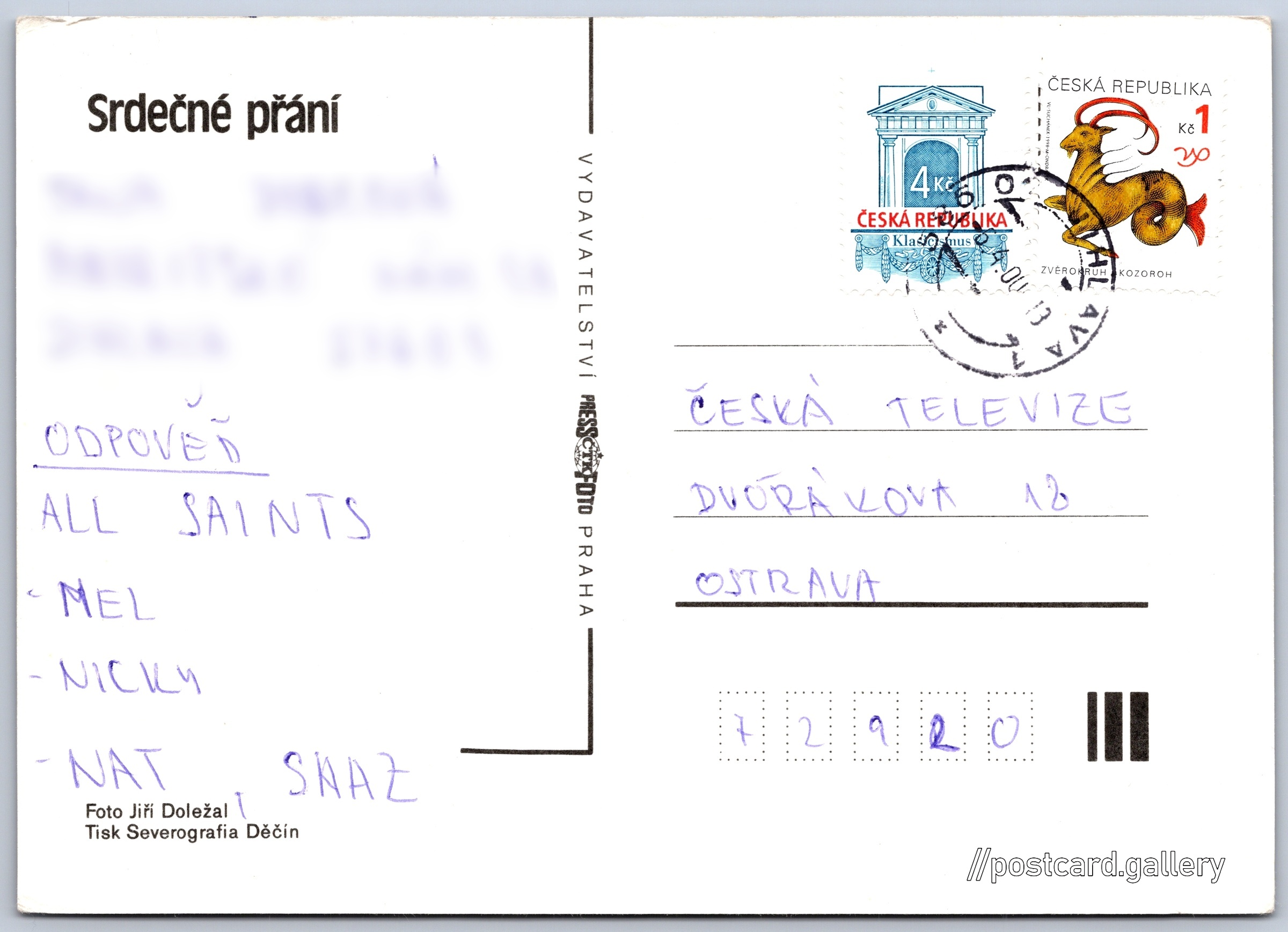 Srdečné přání, květiny Pokud chcete vidět pohlednice ve vyšším rozlišení nebo zobrazovat jejich zadní stranu, tak se prosím nejdříve přihlašte Přihlásit Zaregistrovat Srdečné přání Jazyk tištěného textu na pohlednici: čeština Vydavatel: PressFoto Praha (Československo) Datum vydání není známo Pomozte nám odhadnout datum vzniku pohlednice Velikost (š x v) a tvar pohlednice: 147 x 105 mm (5.79" x 4.13"), obdélník Osoby spjaté s touto pohlednicí: Jiří Doležal(Autor fotografie) Prošlá poštou:Datum na razítku: 6.4.2000 Ceny: Vyplacené známky: 5,00 Kč (CZK) DiskuseVložit příspěvek Přidat novou složku ... Spravovat složky ...