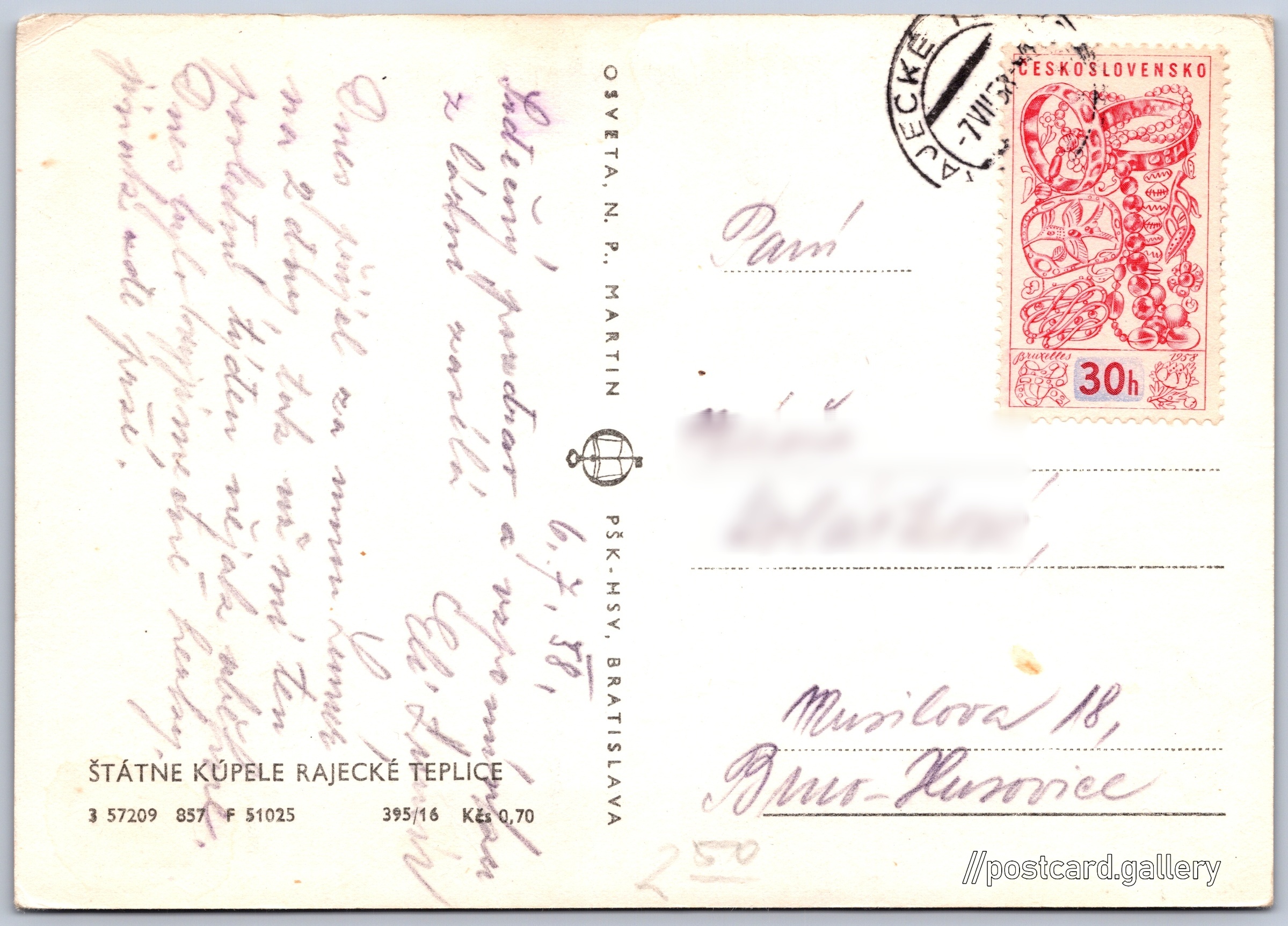 Štátne kúpele Rajecké Teplice Pokud chcete vidět pohlednice ve vyšším rozlišení nebo zobrazovat jejich zadní stranu, tak se prosím nejdříve přihlašte Přihlásit Zaregistrovat ŠTÁTNE KÚPELE RAJECKÉ TEPLICE Jazyk tištěného textu na pohlednici: slovenština Rajecké Teplice, Město, Slovensko ukázat na mapě Vydavatel: Osveta, n. p., Martin PŠK - Bratislava (Československo) Rok vydání pohlednice: srpen, 1957 Velikost (š x v) a tvar pohlednice: 147 x 103 mm (5.79" x 4.06"), obdélník Prošlá poštou:Datum na razítku: 7.7.1958Datum napsání pohledu: 6.7.1958 Ceny: Cena pohlednice: 0,70 Kčs (CSK)Vyplacené známky: 0,30 Kčs (CSK) Kódy na pohlednici: 395/16 3 57209 857 F 51025 DiskuseVložit příspěvek Přidat novou složku ... Spravovat složky ...