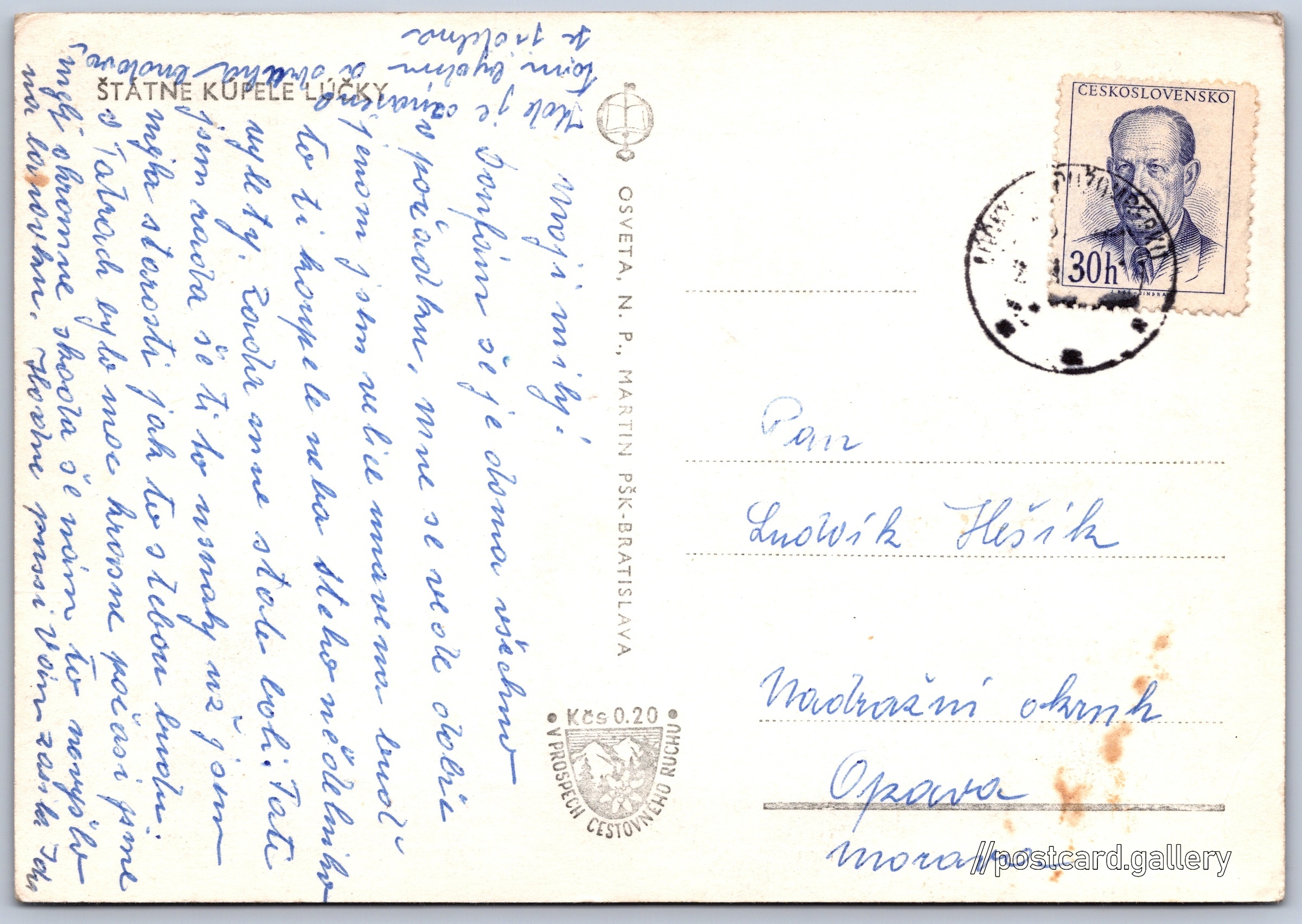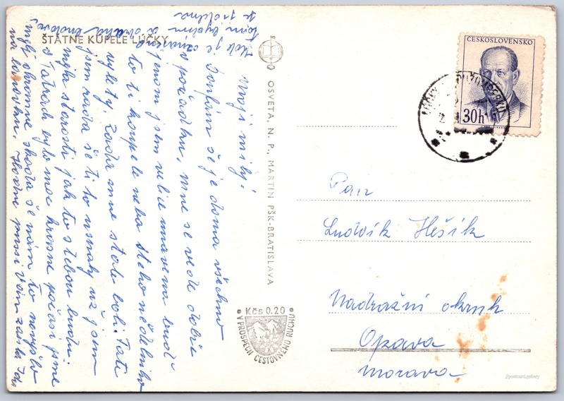 Státní lázně Lúčky Pokud chcete vidět pohlednice ve vyšším rozlišení nebo zobrazovat jejich zadní stranu, tak se prosím nejdříve přihlašte Přihlásit Zaregistrovat ŠTÁTNE KÚPELE LÚČKY Jazyk tištěného textu na pohlednici: čeština Lúčky 535 ukázat na mapě V blízkém okolí místa zobrazeného na pohlednici lze najít 2 jiné pohlednice. Zobrazit blízké pohlednice Vydavatel: Osveta, n. p., Martin PŠK - Bratislava (Československo) Odhadované datum vydání pohlednice: 1960 - 1963 Pomozte nám zpřesnit rok vzniku pohlednice Velikost (š x v) a tvar pohlednice: 147 x 102 mm (5.79" x 4.02"), obdélník Prošlá poštou Ceny: Příplatek na tur. ruch: 0,20 Kčs (CSK))Vyplacené známky: 0,30 Kčs (CSK) DiskuseVložit příspěvek Přidat novou složku ... Spravovat složky ...