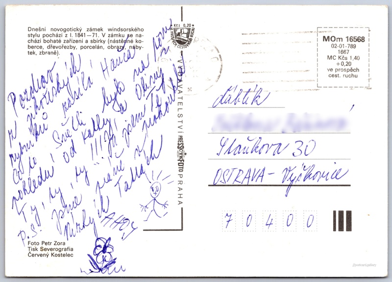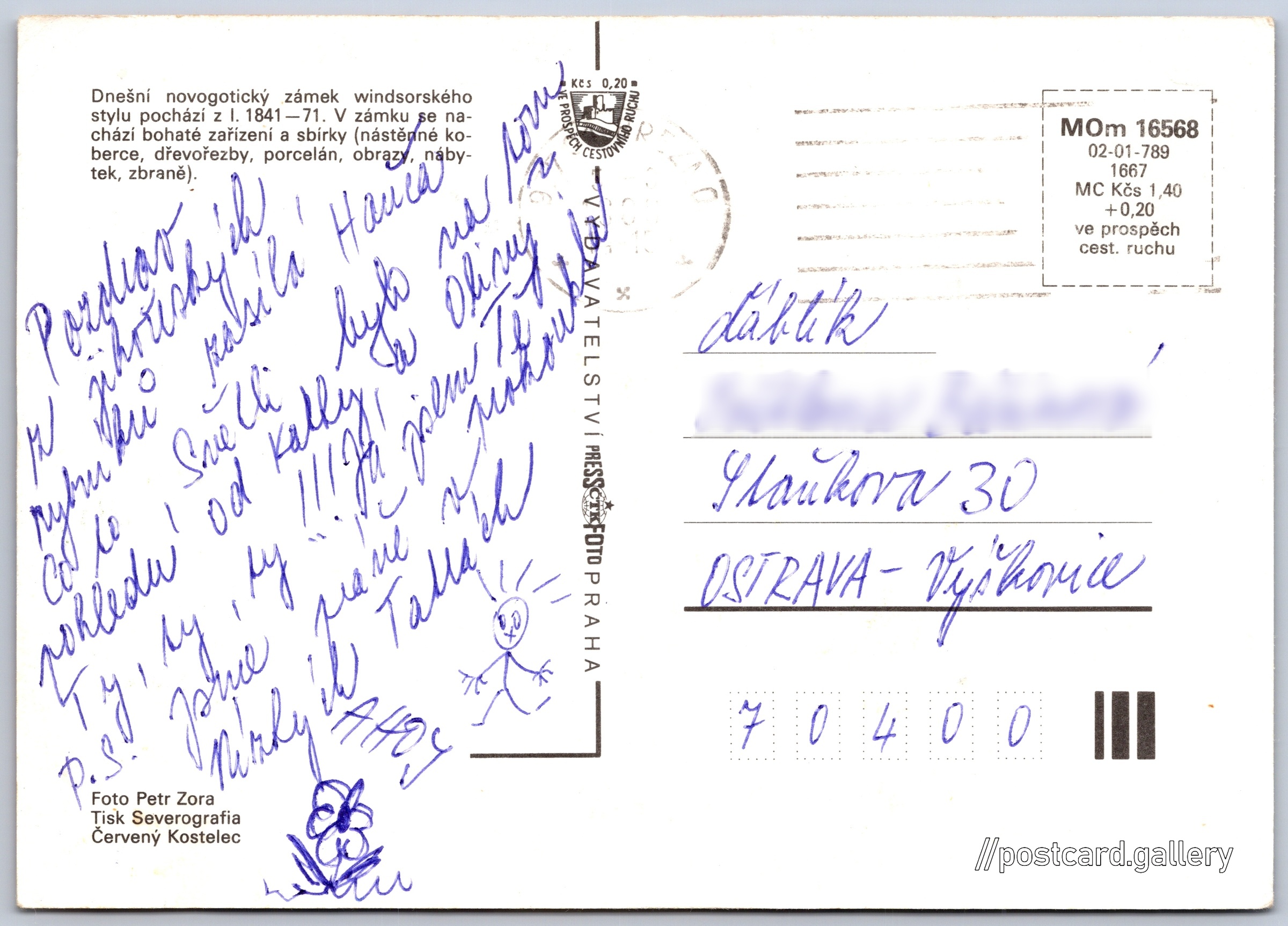 Statní zámek Hluboká Pokud chcete vidět pohlednice ve vyšším rozlišení nebo zobrazovat jejich zadní stranu, tak se prosím nejdříve přihlašte Přihlásit Zaregistrovat Statní zámek Hluboká Dnešní novogotický zámek windsorského stylu pochází z I. 1841-71. V zámku se nachází bohaté zařízení a sbírky (nástěnné koberce, dřevořezby, porcelán, obrazy, nábytek, zbraně). Jazyk tištěného textu na pohlednici: čeština Hluboká nad Vltavou, České Budějovice ukázat na mapě Vydavatel: PressFoto Praha (Československo) Rok vydání pohlednice: 1987 Velikost (š x v) a tvar pohlednice: 148 x 105 mm (5.83" x 4.13"), obdélník Osoby spjaté s touto pohlednicí: Petr Zora(Autor fotografie) Prošlá poštou Ceny: Cena pohlednice: 1,40 Kčs (CSK) (+0,20 Kčs přípl. na tur. ruch) Kódy na pohlednici: MOm 16568 02-01-789 1667 DiskuseVložit příspěvek Přidat novou složku ... Spravovat složky ...