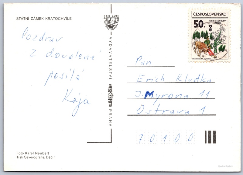 Státní zámek Kratochvíle Pokud chcete vidět pohlednice ve vyšším rozlišení nebo zobrazovat jejich zadní stranu, tak se prosím nejdříve přihlašte Přihlásit Zaregistrovat STÁTNÍ ZÁMEK KRATOCHVÍLE Jazyk tištěného textu na pohlednici: čeština Zámek Kratochvíle, Zámek, Petrův Dvůr 5, Netolice - Petrův Dvůr, Česko ukázat na mapě V blízkém okolí místa zobrazeného na pohlednici lze najít 2 jiné pohlednice. Zobrazit blízké pohlednice Vydavatel: PressFoto Praha (Československo) Datum vydání není známo Pomozte nám odhadnout datum vzniku pohlednice Velikost (š x v) a tvar pohlednice: 148 x 105 mm (5.83" x 4.13"), obdélník Osoby spjaté s touto pohlednicí: Karel Neubert(Autor fotografie) Prošlá poštou Ceny: Příplatek na tur. ruch: 0,20 Kčs (CSK))Vyplacené známky: 0,50 Kčs (CSK) DiskuseVložit příspěvek Přidat novou složku ... Spravovat složky ...