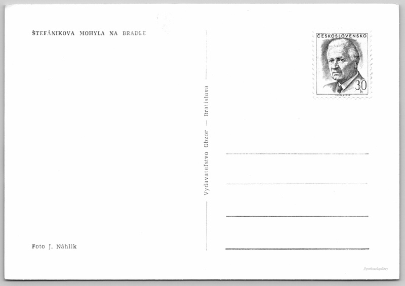 Štefánikova mohyla na Bradle Pokud chcete vidět pohlednice ve vyšším rozlišení nebo zobrazovat jejich zadní stranu, tak se prosím nejdříve přihlašte Přihlásit Zaregistrovat ŠTEFÁNIKOVA MOHYLA NA BRADLE Jazyk tištěného textu na pohlednici: slovenština Mohyla Milana Rastislava Štefánika, Pomník, památník, Brezová pod Bradlom, Slovensko ukázat na mapě Odhadované datum vydání pohlednice: 1967 - 1968 Pomozte nám zpřesnit rok vzniku pohlednice Velikost (š x v) a tvar pohlednice: 148 x 103 mm (5.83" x 4.06"), obdélník Osoby spjaté s touto pohlednicí: Milan Rastislav Štefánik(Obsah pohlednice) J. Náhlik(Autor fotografie) Čistá pohlednice (neprošlá poštou) Ceny: Vyplacené známky: 0,30 Kčs (CSK) DiskuseVložit příspěvek Přidat novou složku ... Spravovat složky ...