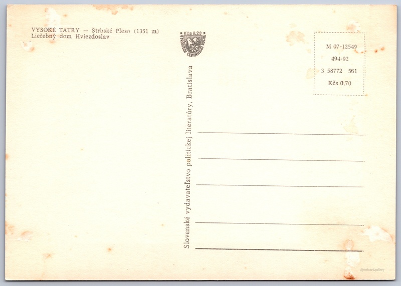 Štrbské pleso, Hviezdoslavova léčebna Pokud chcete vidět pohlednice ve vyšším rozlišení nebo zobrazovat jejich zadní stranu, tak se prosím nejdříve přihlašte Přihlásit Zaregistrovat VYSOKÉ TATRY - Štrbské Pleso (1351 m)Liečebný dom Hviezdoslav Jazyk tištěného textu na pohlednici: slovenština Kúpeľná 4043/6 ukázat na mapě V blízkém okolí místa zobrazeného na pohlednici lze najít 79 jiných pohlednic. Zobrazit blízké pohlednice Vydavatel: VPL (Československo) Rok vydání pohlednice: květen, 1961 Velikost (š x v) a tvar pohlednice: 148 x 103 mm (5.83" x 4.06"), obdélník Osoby spjaté s touto pohlednicí: Pavol Országh Hviezdoslav(Jméno v názvu místa) Čistá pohlednice (neprošlá poštou) Ceny: Cena pohlednice: 0,70 Kčs (CSK) (+0,20 Kčs přípl. na tur. ruch) Kódy na pohlednici: M 07-12549 494-92 3 58772 561 DiskuseVložit příspěvek Přidat novou složku ... Spravovat složky ...