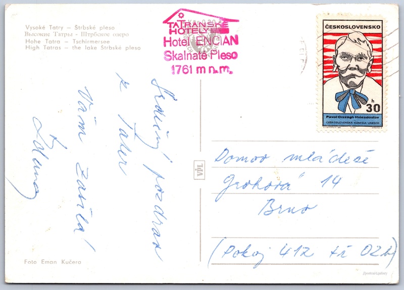 Štrbské pleso 7/80 Pokud chcete vidět pohlednice ve vyšším rozlišení nebo zobrazovat jejich zadní stranu, tak se prosím nejdříve přihlašte Přihlásit Zaregistrovat Vysoké Tatry - Štrbské plesoВысокие Татры - Штрбское озероHohe Tatra - TschirmerseeHigh Tatras - the lake Štrbské pleso Jazyk tištěného textu na pohlednici: slovenština Štrbské pleso, Vodní plocha, Štrba, Slovensko ukázat na mapě V blízkém okolí místa zobrazeného na pohlednici lze najít 80 jiných pohlednic. Zobrazit blízké pohlednice Vydavatel: VPL (Československo) Datum vydání není známo Pomozte nám odhadnout datum vzniku pohlednice Velikost (š x v) a tvar pohlednice: 148 x 105 mm (5.83" x 4.13"), obdélník Osoby spjaté s touto pohlednicí: Eman Kučera(Autor fotografie) Prošlá poštou Ceny: Příplatek na tur. ruch: 0,20 Kčs (CSK))Vyplacené známky: 0,30 Kčs (CSK) DiskuseVložit příspěvek Přidat novou složku ... Spravovat složky ...