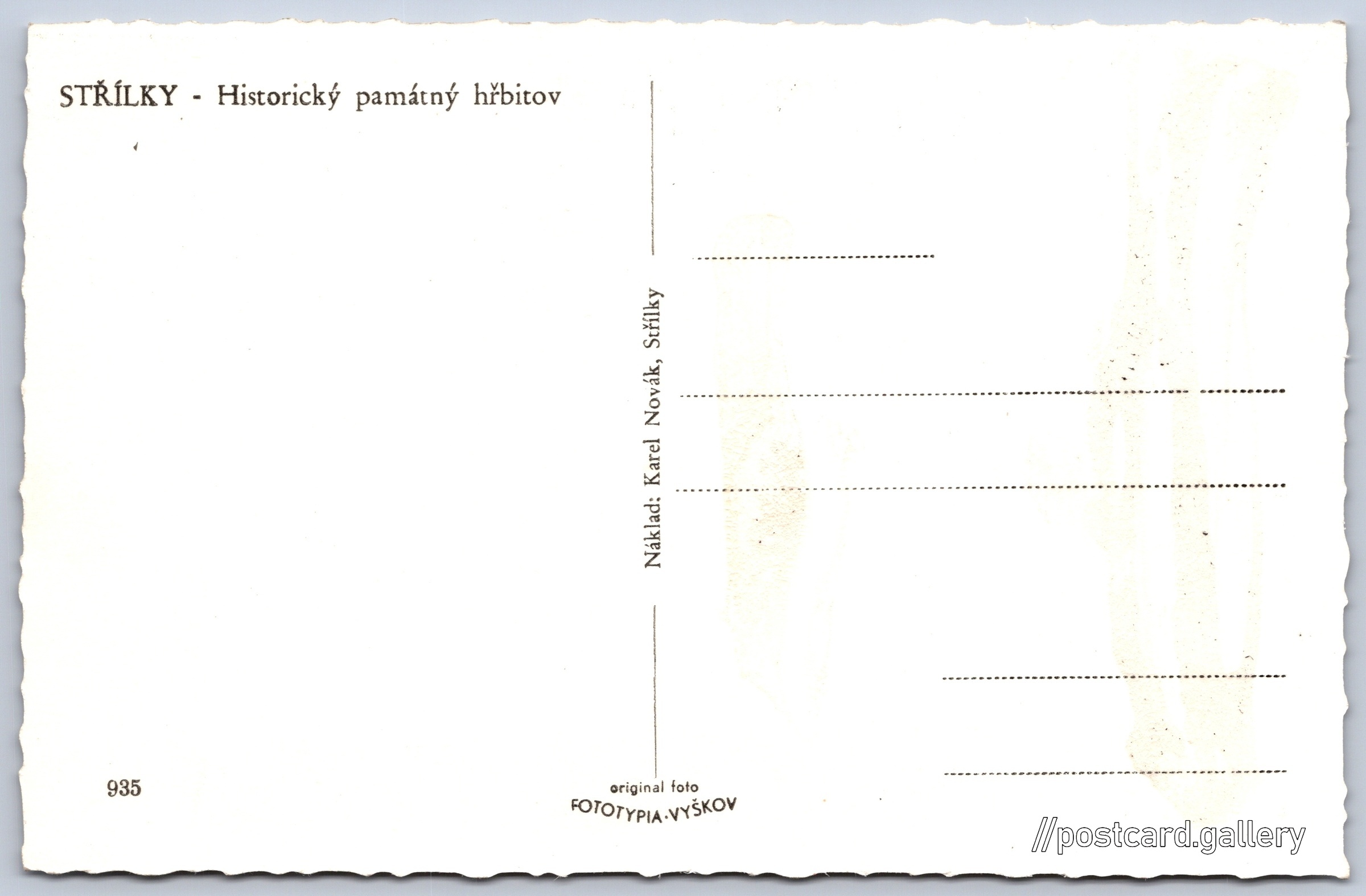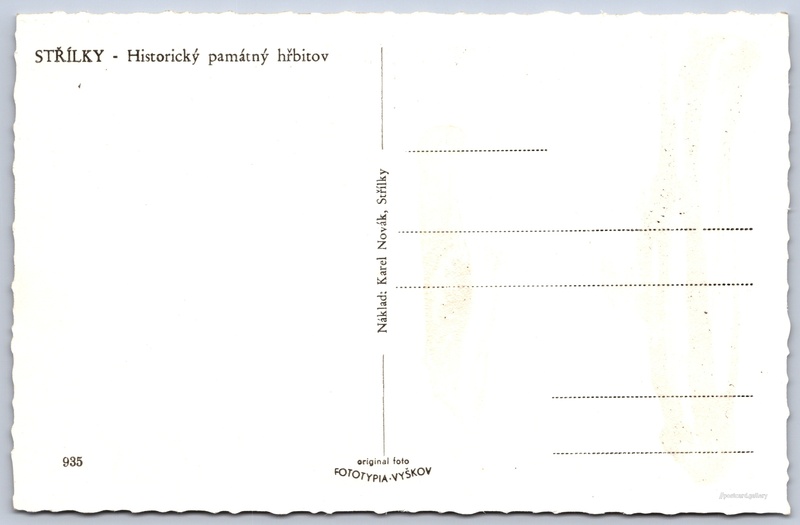 Střílky, historický hřbitov Pokud chcete vidět pohlednice ve vyšším rozlišení nebo zobrazovat jejich zadní stranu, tak se prosím nejdříve přihlašte Přihlásit Zaregistrovat STŘÍLKY - Historický památný hřbitov Jazyk tištěného textu na pohlednici: čeština Hlavní 27, 768 04 Střílky, Czechia ukázat na mapě Vydavatel: Fototypia - Vyškov (Československo)Karel Novák (Československo) Datum vydání není známo Pomozte nám odhadnout datum vzniku pohlednice Velikost (š x v) a tvar pohlednice: 136 x 88 mm (5.35" x 3.46"), obdélník, zoubkovaný Čistá pohlednice (neprošlá poštou) Kódy na pohlednici: 935 DiskuseVložit příspěvek Přidat novou složku ... Spravovat složky ...