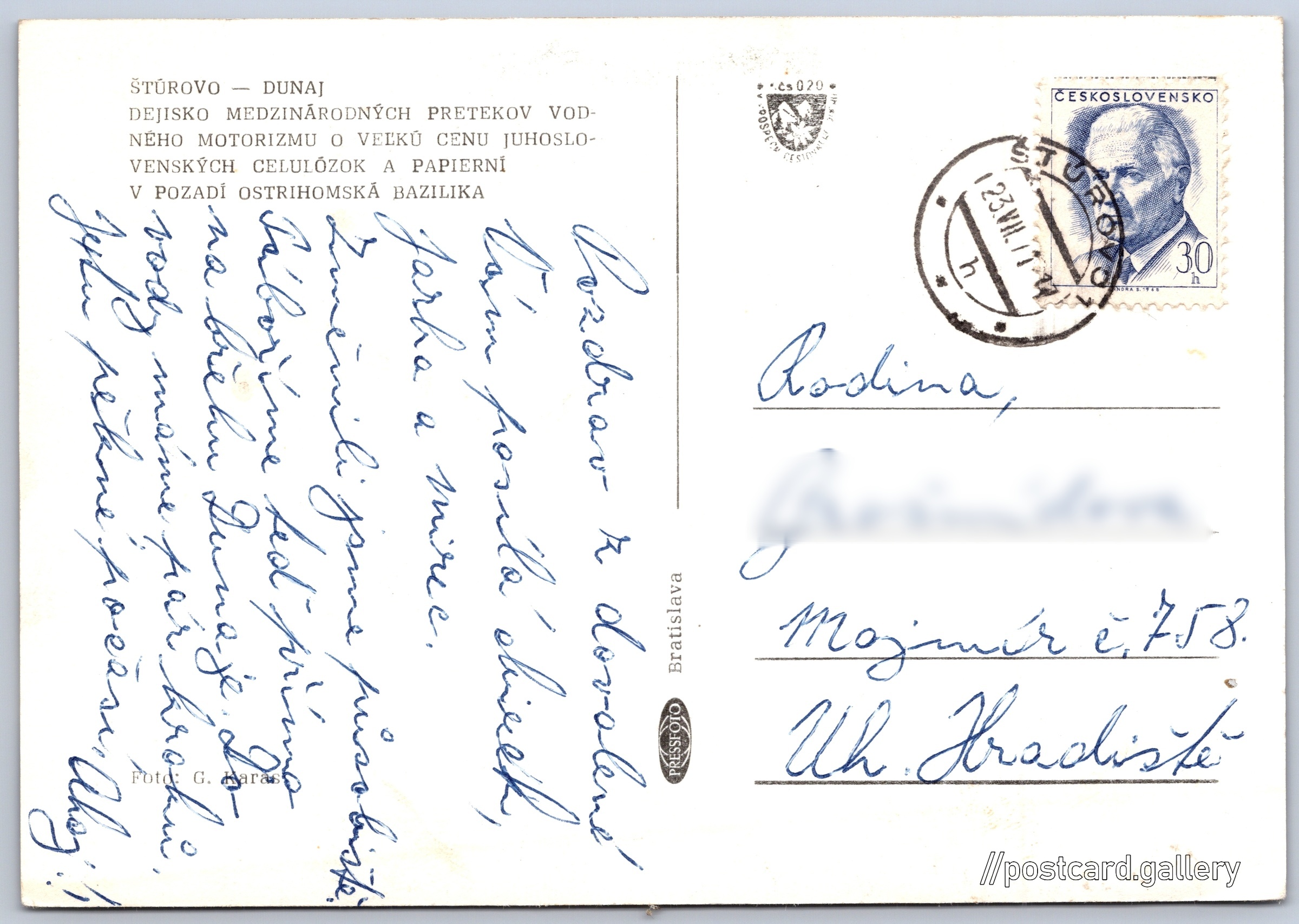 Štúrovo, zničený most Pokud chcete vidět pohlednice ve vyšším rozlišení nebo zobrazovat jejich zadní stranu, tak se prosím nejdříve přihlašte Přihlásit Zaregistrovat ŠTÚROVO - DUNAJDEJISKO MEDZINÁRODNÝCH PRETEKOV VODNÉHO MOTORIZMU O VEĽKÚ CENU JUHOSLOVENSKÝCH CELULÓZOK A PAPIERNÍV POZADÍ OSTRIHOMSKÁ BAZILIKA Jazyk tištěného textu na pohlednici: slovenština Most Márie Valérie ukázat na mapě Vydavatel: PressFoto Bratislava (Československo) Odhadované datum vydání pohlednice: 1968 - 1971 Pomozte nám zpřesnit rok vzniku pohlednice Velikost (š x v) a tvar pohlednice: 147 x 102 mm (5.79" x 4.02"), obdélník Osoby spjaté s touto pohlednicí: G. Karas(Autor fotografie) Prošlá poštou:Datum na razítku: 23.7.1971 Ceny: Příplatek na tur. ruch: 0,20 Kčs (CSK))Vyplacené známky: 0,30 Kčs (CSK) DiskuseVložit příspěvek Přidat novou složku ... Spravovat složky ...