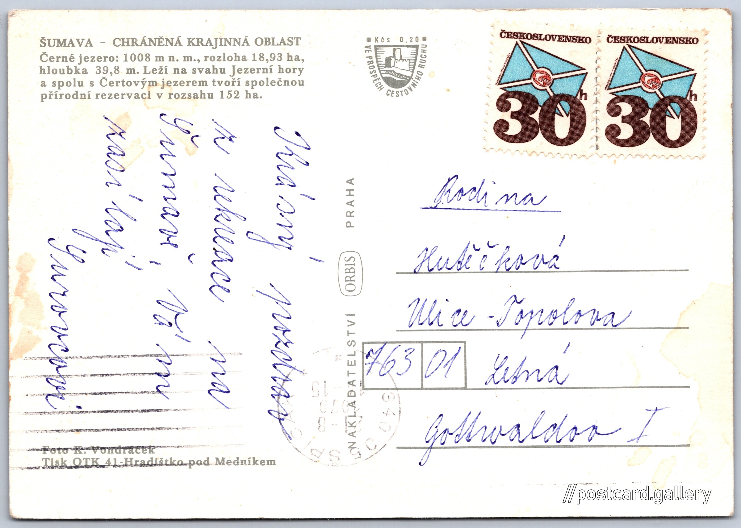 Šumava, Černé jezero Pokud chcete vidět pohlednice ve vyšším rozlišení nebo zobrazovat jejich zadní stranu, tak se prosím nejdříve přihlašte Přihlásit Zaregistrovat ŠUMAVA - CHRÁNĚNÁ KRAJINNÁ OBLASTČerné jezero: 1008 m n. m., rozloha 18,93 ha, hloubka 39,8 m. Leží na svahu Jezerní hory a spolu s Čertovým jezerem tvoří společnoupřírodní rezervaci v rozsahu 152 ha. Jazyk tištěného textu na pohlednici: čeština Hojsova Stráž, Železná Ruda, Klatovy ukázat na mapě V blízkém okolí místa zobrazeného na pohlednici lze najít 8 jiných pohlednic. Zobrazit blízké pohlednice Vydavatel: Nakladatelství Orbis (Československo) Odhadované datum vydání pohlednice: 1976 - 1979 Pomozte nám zpřesnit rok vzniku pohlednice Velikost (š x v) a tvar pohlednice: 148 x 103 mm (5.83" x 4.06"), obdélník Osoby spjaté s touto pohlednicí: K. Vondráček(Autor fotografie) Prošlá poštou:Datum na razítku: 21.8.1979 Ceny: Příplatek na tur. ruch: 0,20 Kčs (CSK))Vyplacené známky: 0,60 Kčs (CSK) DiskuseVložit příspěvek Přidat novou složku ... Spravovat složky ...