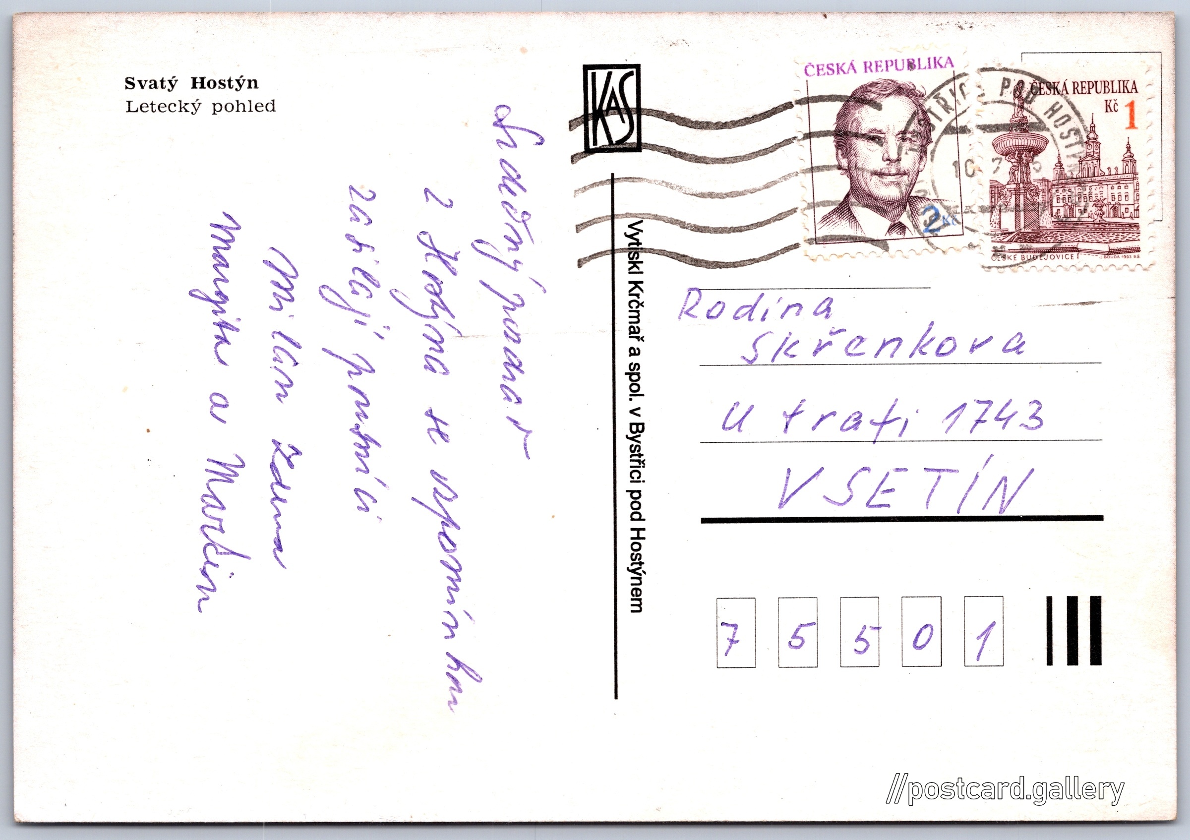 Svatý Hostýn, letecký pohled Pokud chcete vidět pohlednice ve vyšším rozlišení nebo zobrazovat jejich zadní stranu, tak se prosím nejdříve přihlašte Přihlásit Zaregistrovat Svatý HostýnLetecký pohled Jazyk tištěného textu na pohlednici: čeština Poutní areál Svatý Hostýn, Poutní místo, Svatý Hostýn, Chvalčov, Česko ukázat na mapě V blízkém okolí místa zobrazeného na pohlednici lze najít 16 jiných pohlednic. Zobrazit blízké pohlednice Vydavatel: Krčmař a spol. (Česko) Odhadované datum vydání pohlednice: 1992 - 1995 Pomozte nám zpřesnit rok vzniku pohlednice Velikost (š x v) a tvar pohlednice: 150 x 104 mm (5.91" x 4.09"), obdélník Prošlá poštou:Datum na razítku: 10.7.1995 Ceny: Vyplacené známky: 3,00 Kč (CZK) DiskuseVložit příspěvek Přidat novou složku ... Spravovat složky ...