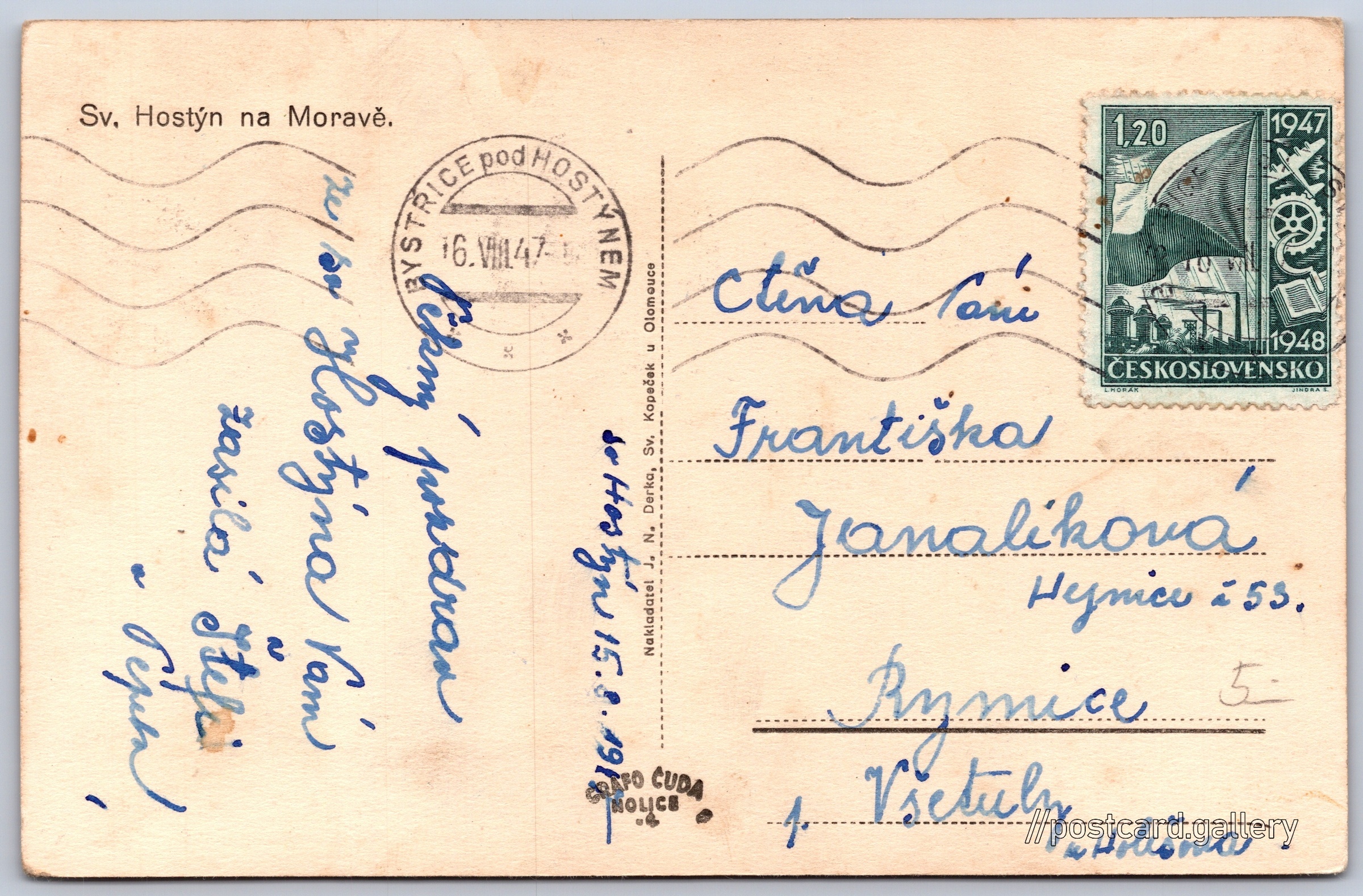 Svatý Hostýn na Moravě Pokud chcete vidět pohlednice ve vyšším rozlišení nebo zobrazovat jejich zadní stranu, tak se prosím nejdříve přihlašte Přihlásit Zaregistrovat Sv. Hostýn na Moravě. Jazyk tištěného textu na pohlednici: čeština Chvalčov, Kroměříž ukázat na mapě V blízkém okolí místa zobrazeného na pohlednici lze najít 16 jiných pohlednic. Zobrazit blízké pohlednice Vydavatel: Grafo Čuda Holice (Československo)J. N. Derka (Československo) Odhadované datum vydání pohlednice: 1945 - 1947 Pomozte nám zpřesnit rok vzniku pohlednice Velikost (š x v) a tvar pohlednice: 139 x 90 mm (5.47" x 3.54"), obdélník Prošlá poštou:Datum na razítku: 16.8.1947Datum napsání pohledu: 15.8.1947 Ceny: Vyplacené známky: 1,20 Kčs (CSK) DiskuseVložit příspěvek Přidat novou složku ... Spravovat složky ...