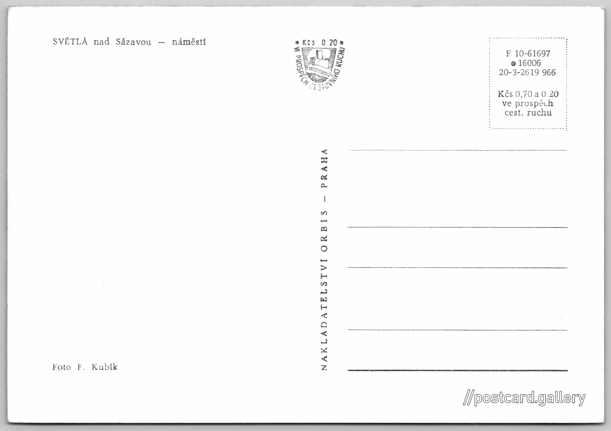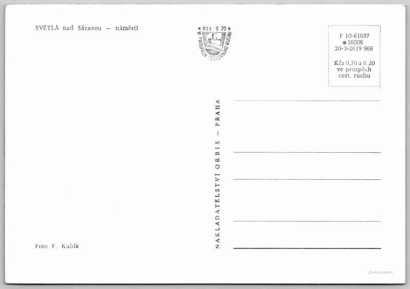 Světlá nad Sázavou, náměstí Pokud chcete vidět pohlednice ve vyšším rozlišení nebo zobrazovat jejich zadní stranu, tak se prosím nejdříve přihlašte Přihlásit Zaregistrovat SVĚTLÁ nad Sázavou - náměstí Jazyk tištěného textu na pohlednici: čeština náměstí Trčků z Lípy, Světlá nad Sázavou, Havlíčkův Brod ukázat na mapě Vydavatel: Nakladatelství Orbis (Československo) Rok vydání pohlednice: září, 1966 Velikost (š x v) a tvar pohlednice: 147 x 102 mm (5.79" x 4.02"), obdélník Osoby spjaté s touto pohlednicí: F. Kubík(Autor fotografie) Čistá pohlednice (neprošlá poštou) Ceny: Cena pohlednice: 0,70 Kčs (CSK) (+0,20 Kčs přípl. na tur. ruch) Kódy na pohlednici: F 10-61697 •16006 20-3-2619 966 DiskuseVložit příspěvek Přidat novou složku ... Spravovat složky ...