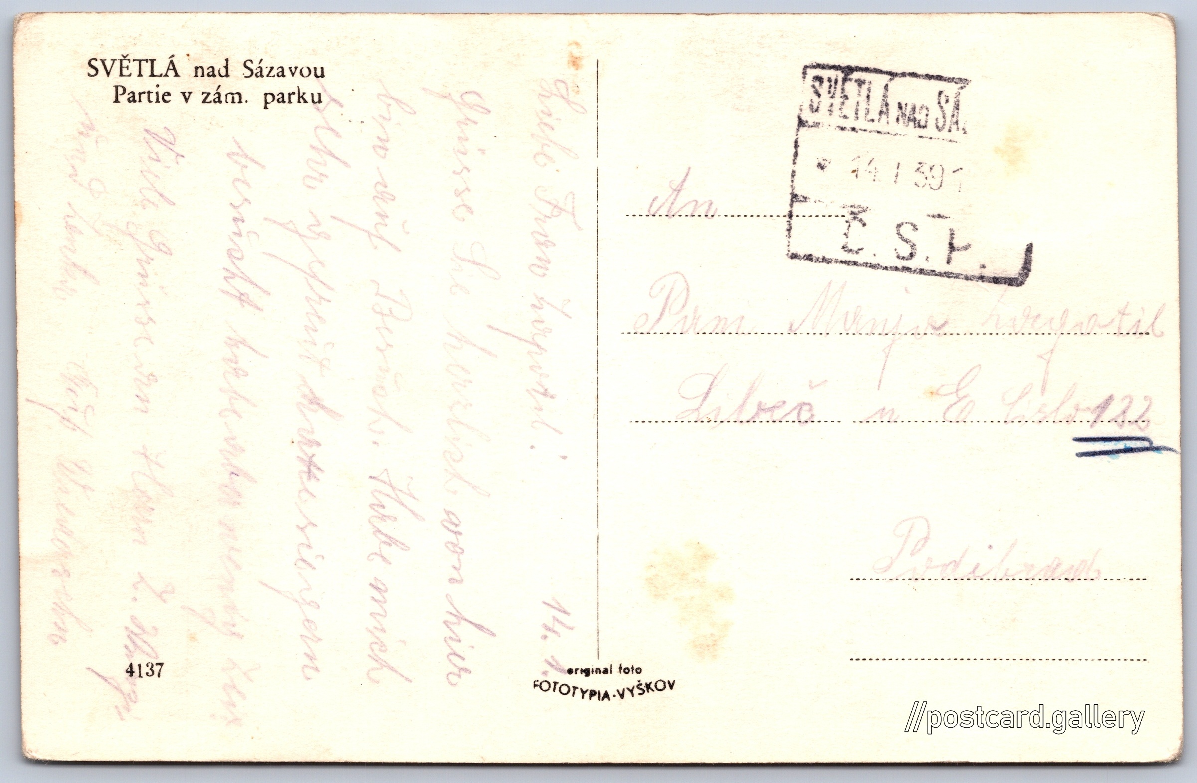 Světlá nad Sázavou, park Pokud chcete vidět pohlednice ve vyšším rozlišení nebo zobrazovat jejich zadní stranu, tak se prosím nejdříve přihlašte Přihlásit Zaregistrovat SVĚTLÁ nad SázavouPartie v zám. parku Jazyk tištěného textu na pohlednici: čeština Světlá nad Sázavou, Havlíčkův Brod ukázat na mapě Vydavatel: Fototypia - Vyškov (Československo) Odhadované datum vydání pohlednice: 1936 - 1939 Pomozte nám zpřesnit rok vzniku pohlednice Velikost (š x v) a tvar pohlednice: 138 x 89 mm (5.43" x 3.50"), obdélník Prošlá poštou:Datum na razítku: 14.1.1939Datum napsání pohledu: 14.1.1939 Kódy na pohlednici: 4137 DiskuseVložit příspěvek Přidat novou složku ... Spravovat složky ...