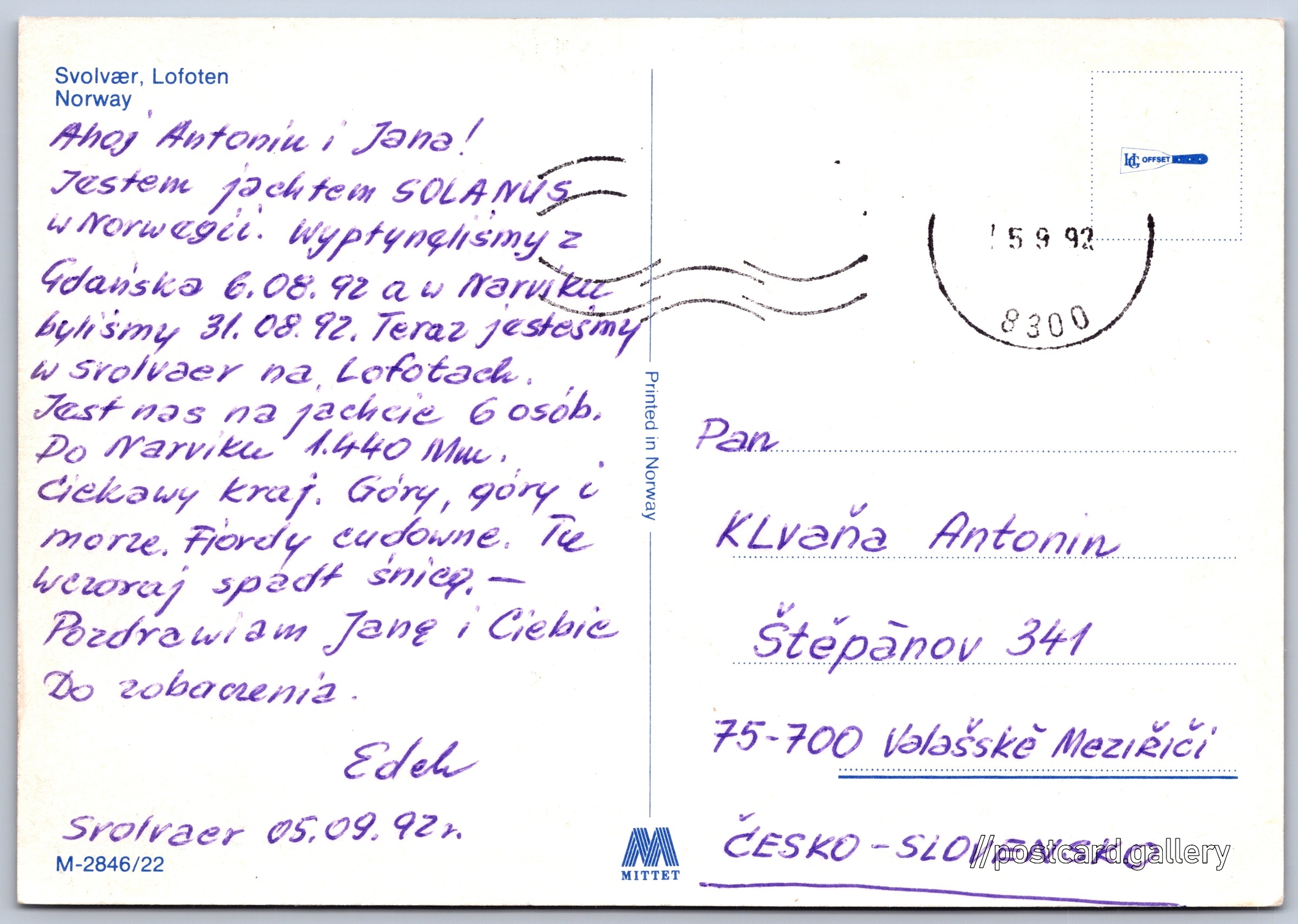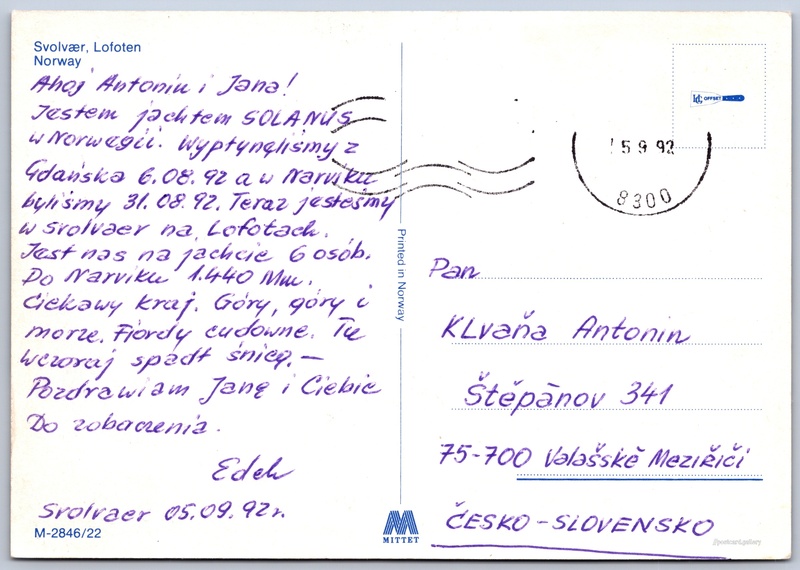 Svolvær, Lofoten Pokud chcete vidět pohlednice ve vyšším rozlišení nebo zobrazovat jejich zadní stranu, tak se prosím nejdříve přihlašte Přihlásit Zaregistrovat SvolværLofoten Svolvær, LofotenNorway Jazyk tištěného textu na pohlednici: norština Svolvær, Město, Norsko ukázat na mapě Vydavatel: Mittet (Norsko) Odhadované datum vydání pohlednice: 1989 - 1992 Pomozte nám zpřesnit rok vzniku pohlednice Velikost (š x v) a tvar pohlednice: 148 x 103 mm (5.83" x 4.06"), obdélník Prošlá poštou:Datum na razítku: 5.9.1992Datum napsání pohledu: 5.9.1992 Kódy na pohlednici: M-2846/22 DiskuseVložit příspěvek Přidat novou složku ... Spravovat složky ...