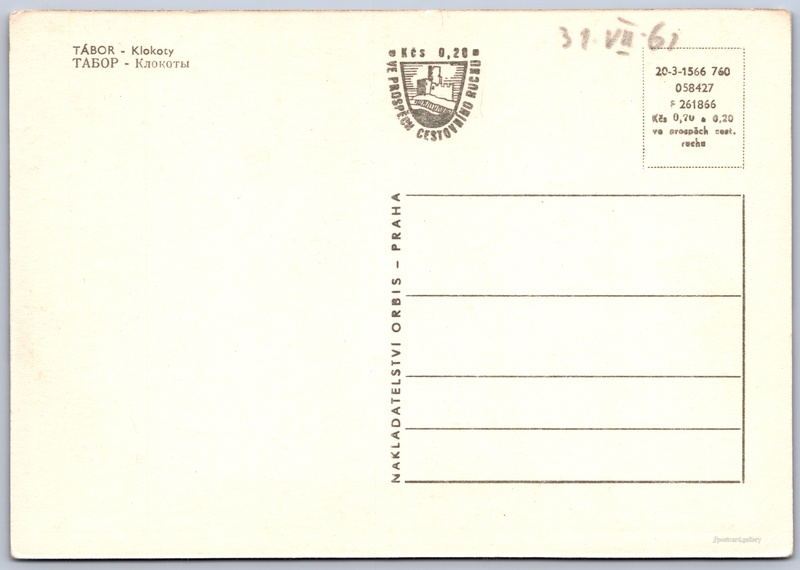 Tábor, Klokoty Pokud chcete vidět pohlednice ve vyšším rozlišení nebo zobrazovat jejich zadní stranu, tak se prosím nejdříve přihlašte Přihlásit Zaregistrovat TÁBOR - KlokotyТАБОР - Клокоты Jazyk tištěného textu na pohlednici: ruština Staroklokotská 1, Tábor, 390 03, Tábor ukázat na mapě V blízkém okolí místa zobrazeného na pohlednici lze najít 7 jiných pohlednic. Zobrazit blízké pohlednice Vydavatel: Nakladatelství Orbis (Československo) Rok vydání pohlednice: červenec, 1960 Velikost (š x v) a tvar pohlednice: 147 x 103 mm (5.79" x 4.06"), obdélník Čistá pohlednice (neprošlá poštou) Ceny: Cena pohlednice: 0,70 Kčs (CSK) (+0,20 Kčs přípl. na tur. ruch) Kódy na pohlednici: 20-3-1566 760 058427 261866 DiskuseVložit příspěvek Přidat novou složku ... Spravovat složky ...