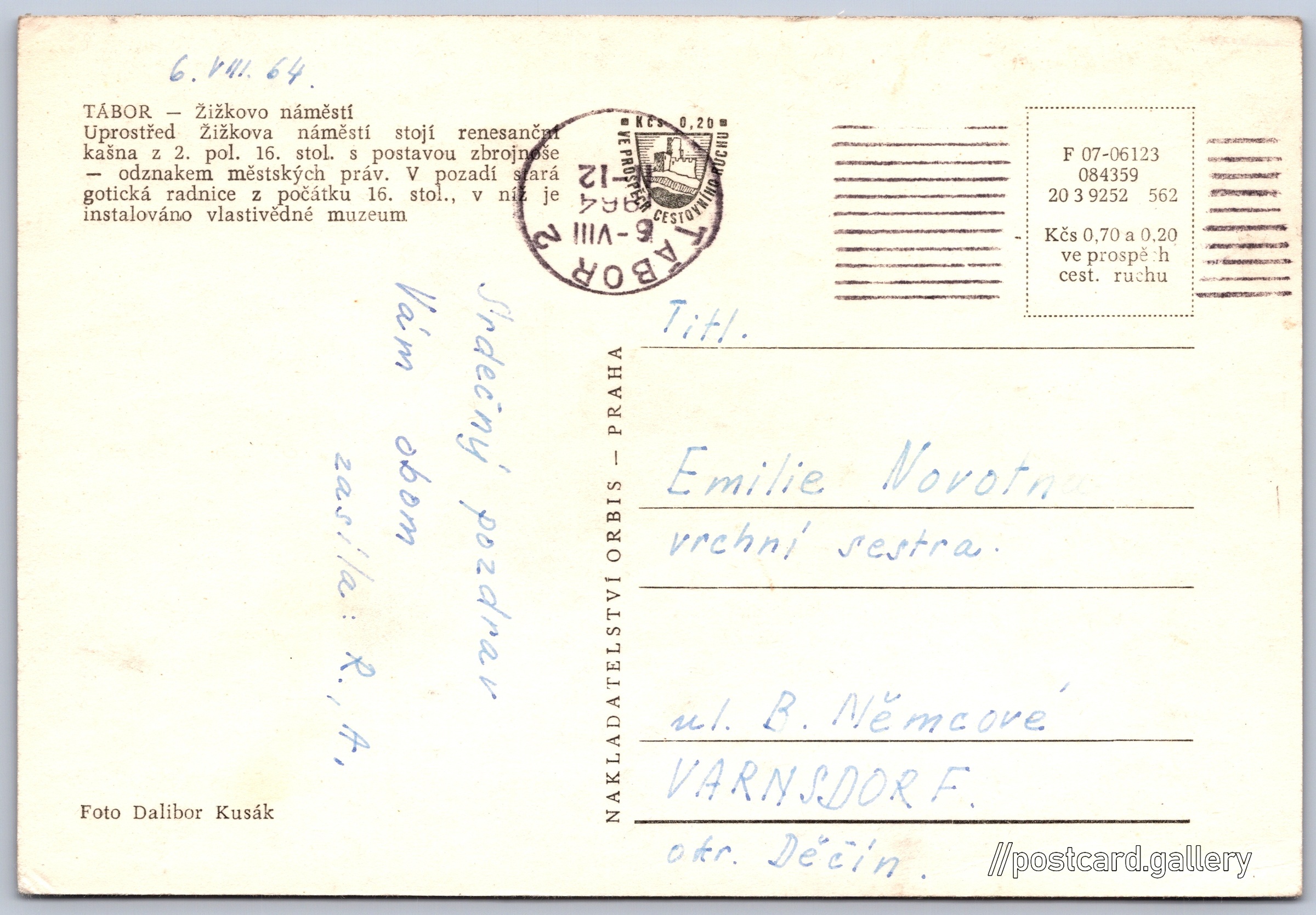 Tábor, Žižkovo náměstí Pokud chcete vidět pohlednice ve vyšším rozlišení nebo zobrazovat jejich zadní stranu, tak se prosím nejdříve přihlašte Přihlásit Zaregistrovat TÁBOR - Žižkovo náměstíUprostřed Žižkova náměstí stojí renesanční kašna z 2. pol. 16. stol. s postavou zbrojnoše odznakem městských práv. V pozadí stará gotická radnice z počátku 16. stol., v níž je instalováno vlastivědné muzeum Jazyk tištěného textu na pohlednici: čeština Žižkovo nám., Tábor, Tábor ukázat na mapě V blízkém okolí místa zobrazeného na pohlednici lze najít 7 jiných pohlednic. Zobrazit blízké pohlednice Vydavatel: Nakladatelství Orbis (Československo) Rok vydání pohlednice: květen, 1962 Velikost (š x v) a tvar pohlednice: 146 x 100 mm (5.75" x 3.94"), obdélník Osoby spjaté s touto pohlednicí: Dalibor Kusák(Autor fotografie) Prošlá poštou:Datum na razítku: 6.8.1964 Ceny: Cena pohlednice: 0,70 Kčs (CSK) (+0,20 Kčs přípl. na tur. ruch) Kódy na pohlednici: F 07-06123 084359 20 3 9252 562 DiskuseVložit příspěvek Přidat novou složku ... Spravovat složky ...
