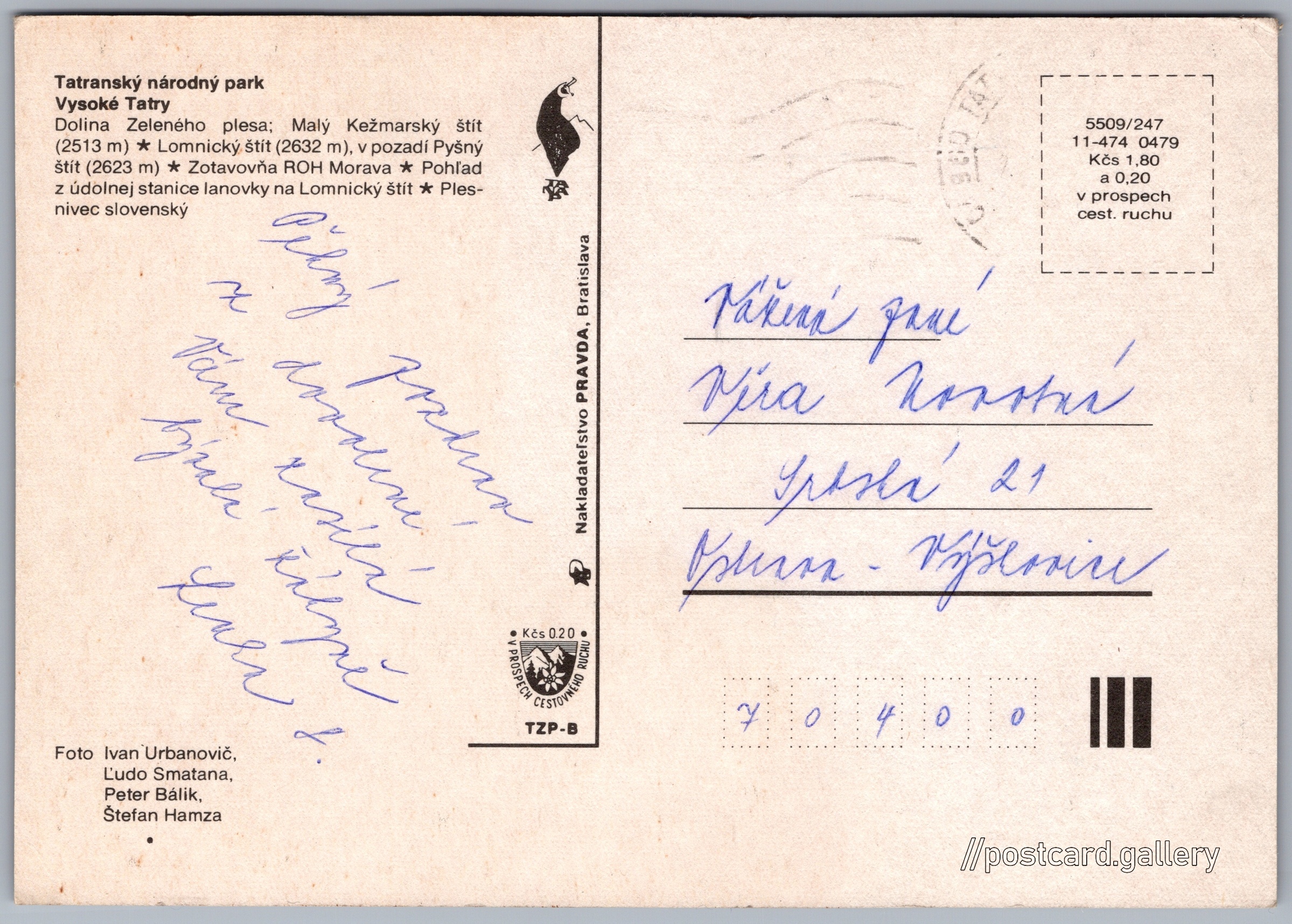 Tatranská Lomnica Pokud chcete vidět pohlednice ve vyšším rozlišení nebo zobrazovat jejich zadní stranu, tak se prosím nejdříve přihlašte Přihlásit Zaregistrovat Tatranská Lomnica Tatranský národný parkVysoké Tatry- Dolina Zeleného plesa; Malý Kežmarský štít (2513 m)- Lomnický štít (2632 m), v pozadí Pyšný štít (2623 m)- Zotavovňa ROH Morava- Pohľad z údolnej stanice lanovky na Lomnický štít- Plesnivec slovenský Jazyk tištěného textu na pohlednici: slovenština Dolina Zeleného plesa, Kaňon, rokle, soutěska, údolí, Tatranská Lomnica 445, Vysoké Tatry - Tatranská Lomnica, Slovensko ukázat na mapě V blízkém okolí místa zobrazeného na pohlednici lze najít 139 jiných pohlednic. Zobrazit blízké pohlednice Vydavatel: Nakladateľstvo PRAVDA, Bratislava (Československo) Rok vydání pohlednice: duben, 1979 Velikost (š x v) a tvar pohlednice: 147 x 103 mm (5.79" x 4.06"), obdélník Osoby spjaté s touto pohlednicí: Peter Bálik(Autor fotografie) Ľudo Smatana(Autor fotografie) Ivan Urbanovič(Autor fotografie) Štefan Hamza(Autor fotografie) Prošlá poštou Ceny: Cena pohlednice: 1,80 Kčs (CSK) (+0,20 Kčs přípl. na tur. ruch) Kódy na pohlednici: 11-474 0479 5509/247 DiskuseVložit příspěvek Přidat novou složku ... Spravovat složky ...
