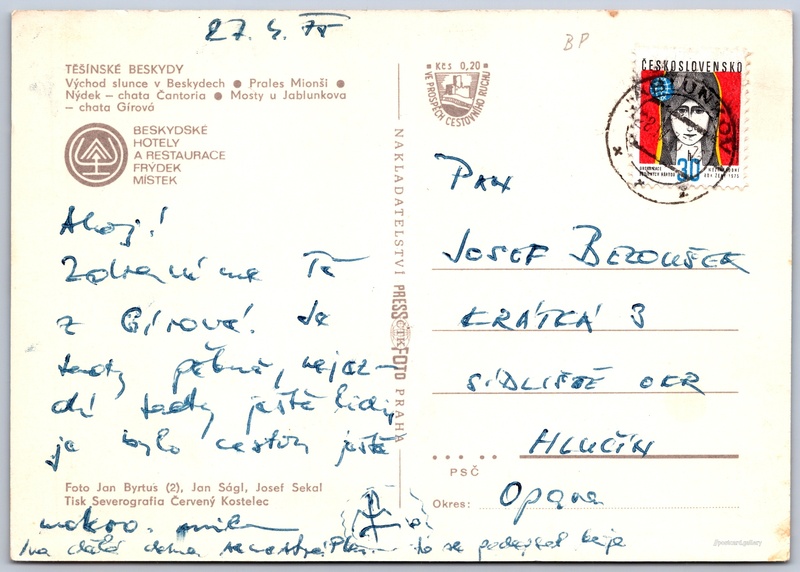 Těšínské Beskydy Pokud chcete vidět pohlednice ve vyšším rozlišení nebo zobrazovat jejich zadní stranu, tak se prosím nejdříve přihlašte Přihlásit Zaregistrovat Těšínské Beskydy TĚŠÍNSKÉ BESKYDY- Východ slunce v Beskydech- Prales Mionši- Nýdek - chata Čantoria- Mosty u Jablunkova - chata GírováBESKYDSKÉ HOTELY A RESTAURACE FRÝDEK MÍSTEK Jazyk tištěného textu na pohlednici: čeština Národní přírodní rezervace Mionší, Chráněné území, okres Frýdek-Místek, Moravskoslezský kraj, Česko ukázat na mapě V blízkém okolí místa zobrazeného na pohlednici lze najít 12 jiných pohlednic. Zobrazit blízké pohlednice Vydavatel: PressFoto Praha (Československo) Odhadované datum vydání pohlednice: 1972 - 1975 Pomozte nám zpřesnit rok vzniku pohlednice Velikost (š x v) a tvar pohlednice: 149 x 105 mm (5.87" x 4.13"), obdélník Osoby spjaté s touto pohlednicí: Jan Ságl(Autor fotografie) Josef Sekal(Autor fotografie) Jan Byrtus(Autor fotografie) Prošlá poštou:Datum na razítku: 27.4.1975Datum napsání pohledu: 27.4.1975 Ceny: Příplatek na tur. ruch: 0,20 Kčs (CSK))Vyplacené známky: 0,30 Kčs (CSK) DiskuseVložit příspěvek Přidat novou složku ... Spravovat složky ...