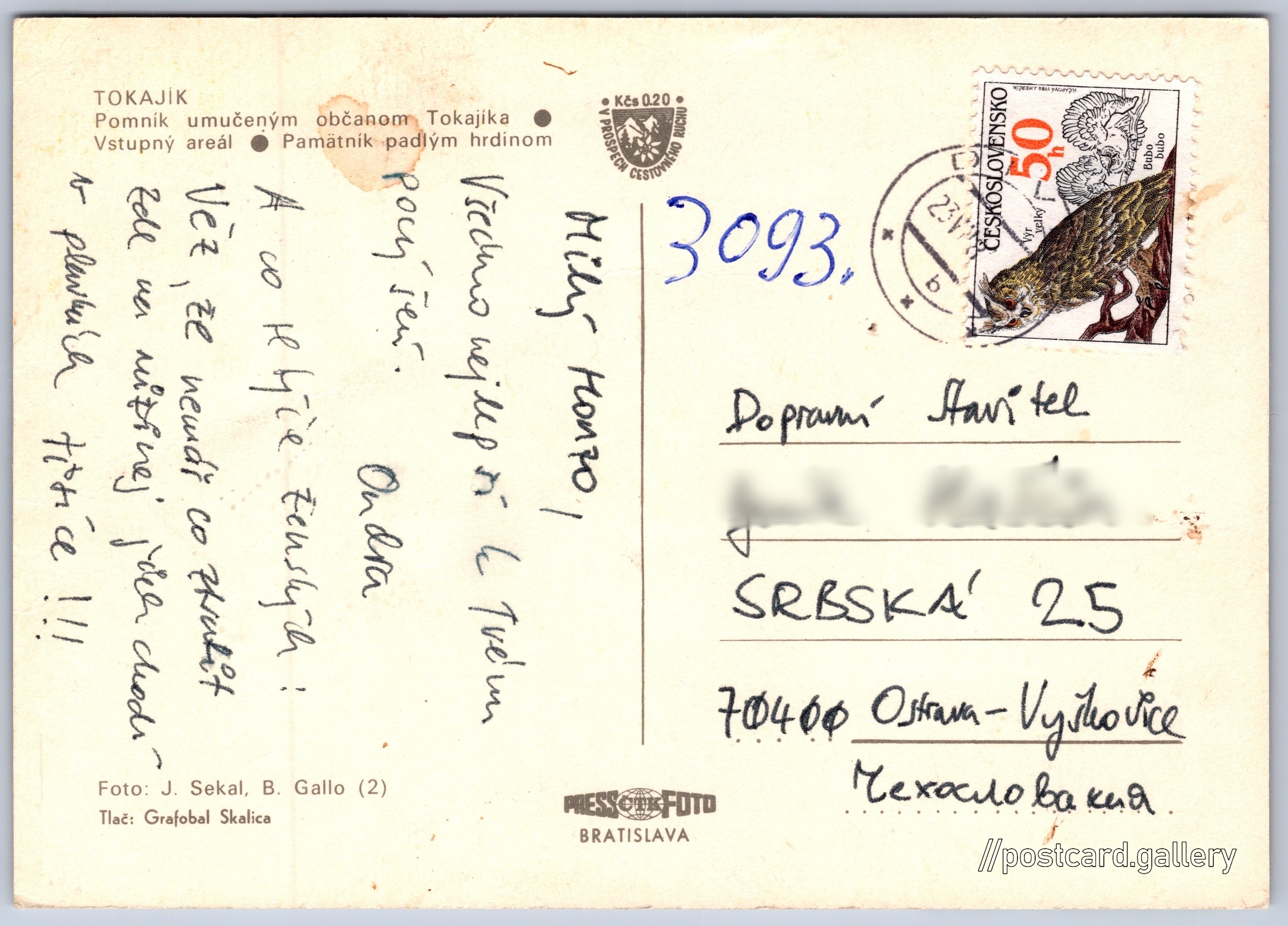 Tokajík Pokud chcete vidět pohlednice ve vyšším rozlišení nebo zobrazovat jejich zadní stranu, tak se prosím nejdříve přihlašte Přihlásit Zaregistrovat Tokajík TOKAJÍK- Pomník umučeným občanom Tokajíka- Vstupný areál- Pamätník padlým hrdinom Jazyk tištěného textu na pohlednici: slovenština 3573 ukázat na mapě Vydavatel: PressFoto Praha (Československo) Datum vydání není známo Pomozte nám odhadnout datum vzniku pohlednice Velikost (š x v) a tvar pohlednice: 148 x 105 mm (5.83" x 4.13"), obdélník Osoby spjaté s touto pohlednicí: Josef Sekal(Autor fotografie) B. Gallo(Autor fotografie) Prošlá poštou Ceny: Příplatek na tur. ruch: 0,20 Kčs (CSK))Vyplacené známky: 0,50 Kčs (CSK) DiskuseVložit příspěvek Přidat novou složku ... Spravovat složky ...