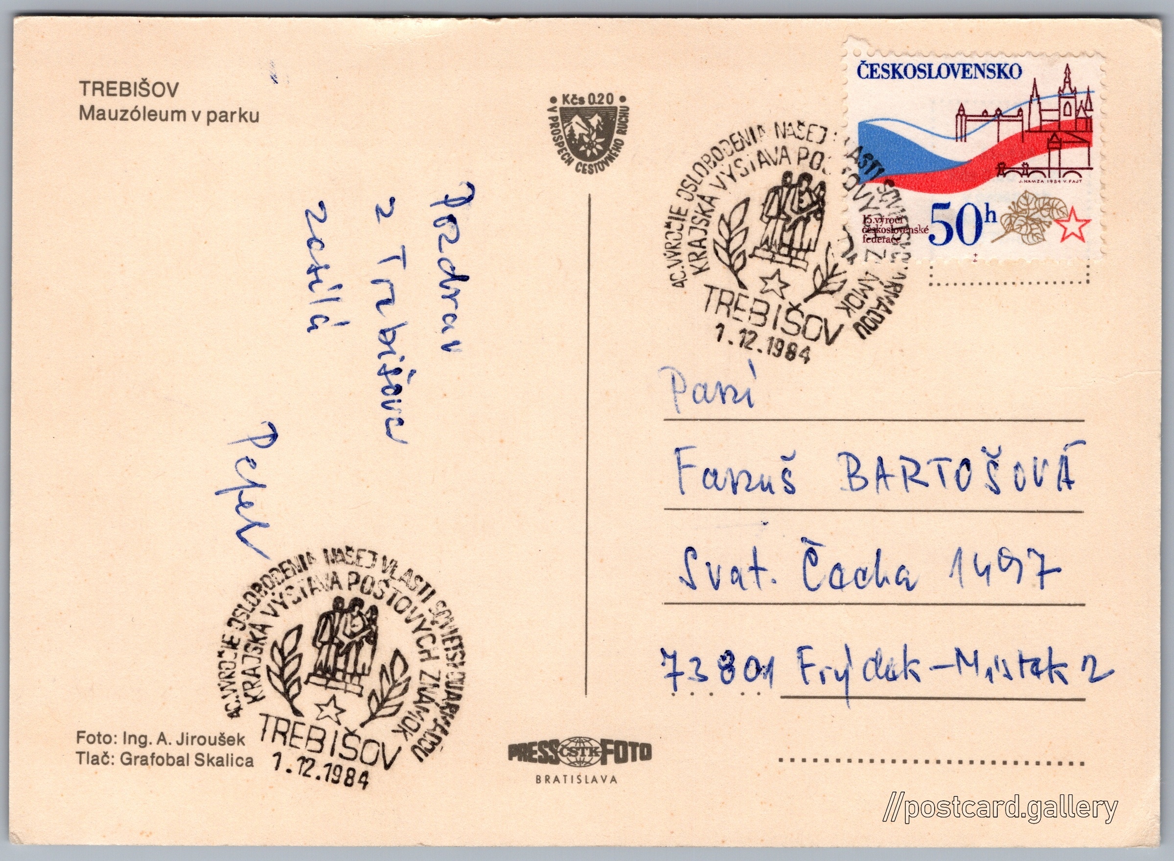 Trabišov, mauzóleum Pokud chcete vidět pohlednice ve vyšším rozlišení nebo zobrazovat jejich zadní stranu, tak se prosím nejdříve přihlašte Přihlásit Zaregistrovat TREBIŠOVMauzóleum v parku Jazyk tištěného textu na pohlednici: slovenština Mauzóleum grófa Júliusa Andrássyho, Pomník, památník, Trebišov, Slovensko ukázat na mapě Vydavatel: PressFoto Bratislava (Československo) Odhadované datum vydání pohlednice: 1981 - 1984 Pomozte nám zpřesnit rok vzniku pohlednice Velikost (š x v) a tvar pohlednice: 146 x 105 mm (5.75" x 4.13"), obdélník Osoby spjaté s touto pohlednicí: Alexander Jiroušek(Autor fotografie) Prošlá poštou:Datum na razítku: 1.12.1984 Ceny: Příplatek na tur. ruch: 0,20 Kčs (CSK))Vyplacené známky: 0,50 Kčs (CSK) DiskuseVložit příspěvek Přidat novou složku ... Spravovat složky ...