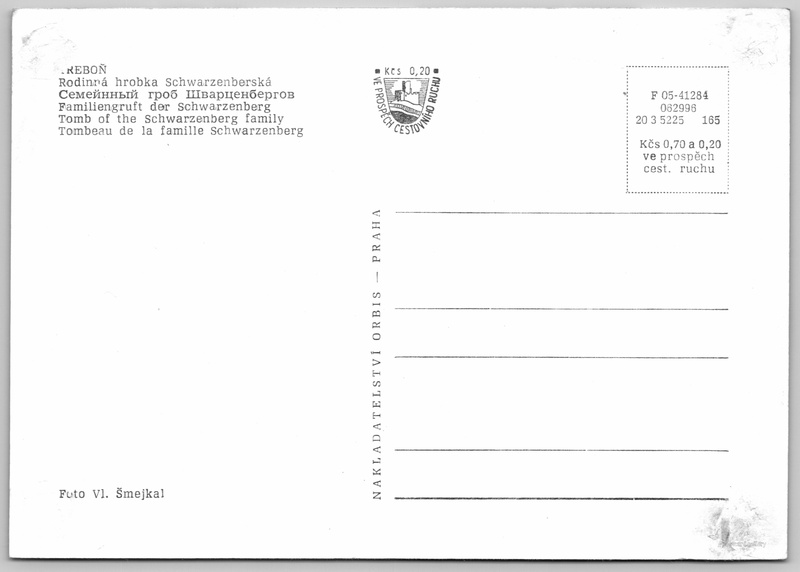 Třeboň, rodinná hrobka Schwarzenberská Pokud chcete vidět pohlednice ve vyšším rozlišení nebo zobrazovat jejich zadní stranu, tak se prosím nejdříve přihlašte Přihlásit Zaregistrovat TŘEBOŇ- Rodinná hrobka Schwarzenberská- Семейнный гроб Шварценбергов- Familiengruft der Schwarzenberg- Tomb of the Schwarzenberg family- Tombeau de la famille Schwarzenberg Jazyk tištěného textu na pohlednici: čeština Schwarzenberská hrobka Domanín, Domanín, Domanín, Jihočeský kraj, Česko ukázat na mapě V blízkém okolí místa zobrazeného na pohlednici lze najít 7 jiných pohlednic. Zobrazit blízké pohlednice Vydavatel: Nakladatelství Orbis (Československo) Rok vydání pohlednice: leden, 1965 Velikost (š x v) a tvar pohlednice: 147 x 103 mm (5.79" x 4.06"), obdélník Osoby spjaté s touto pohlednicí: Vl. Šmejkal(Autor fotografie) Čistá pohlednice (neprošlá poštou) Ceny: Cena pohlednice: 0,70 Kčs (CSK) (+0,20 Kčs přípl. na tur. ruch) Kódy na pohlednici: F 05-41284 062996 20 3 5225 165 DiskuseVložit příspěvek Přidat novou složku ... Spravovat složky ...