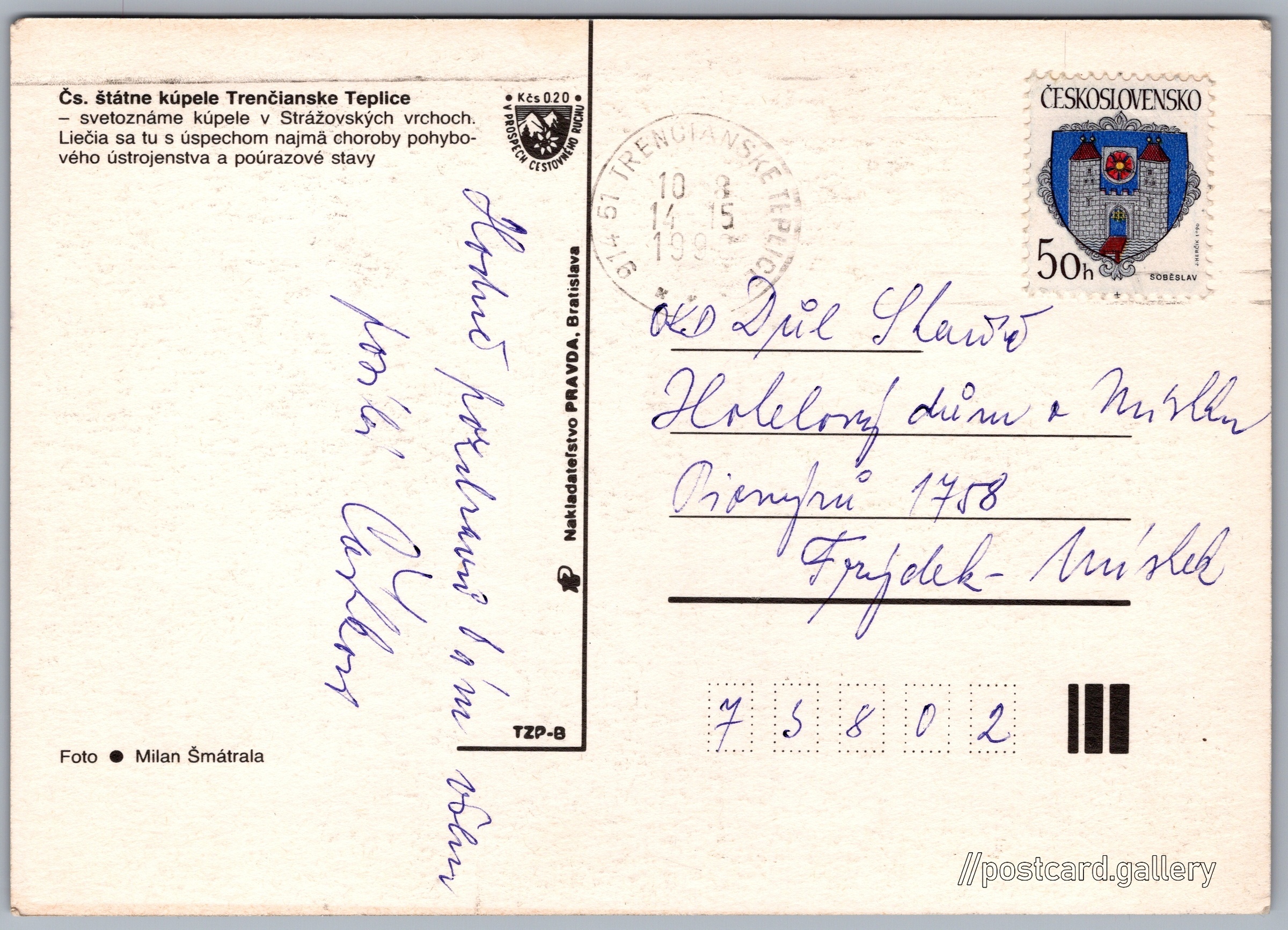 Trenčianske Teplice Pokud chcete vidět pohlednice ve vyšším rozlišení nebo zobrazovat jejich zadní stranu, tak se prosím nejdříve přihlašte Přihlásit Zaregistrovat Trenčianske Teplice Čs. štátne kúpele Trenčianske TepliceSvetoznáme kúpele v Strážovských vrchoch. Liečia sa tu s úspechom najmä choroby pohybového ústrojenstva a poúrazové stavy Jazyk tištěného textu na pohlednici: slovenština Trenčianske Teplice, Město, Slovensko ukázat na mapě V blízkém okolí místa zobrazeného na pohlednici lze najít 13 jiných pohlednic. Zobrazit blízké pohlednice Vydavatel: Nakladateľstvo PRAVDA, Bratislava (Československo) Odhadované datum vydání pohlednice: 1987 - 1990 Pomozte nám zpřesnit rok vzniku pohlednice Velikost (š x v) a tvar pohlednice: 149 x 106 mm (5.87" x 4.17"), obdélník Osoby spjaté s touto pohlednicí: Milan Šmátrala(Autor fotografie) Prošlá poštou:Datum na razítku: 10.8.1990 Ceny: Příplatek na tur. ruch: 0,20 Kčs (CSK))Vyplacené známky: 0,50 Kčs (CSK) DiskuseVložit příspěvek Přidat novou složku ... Spravovat složky ...