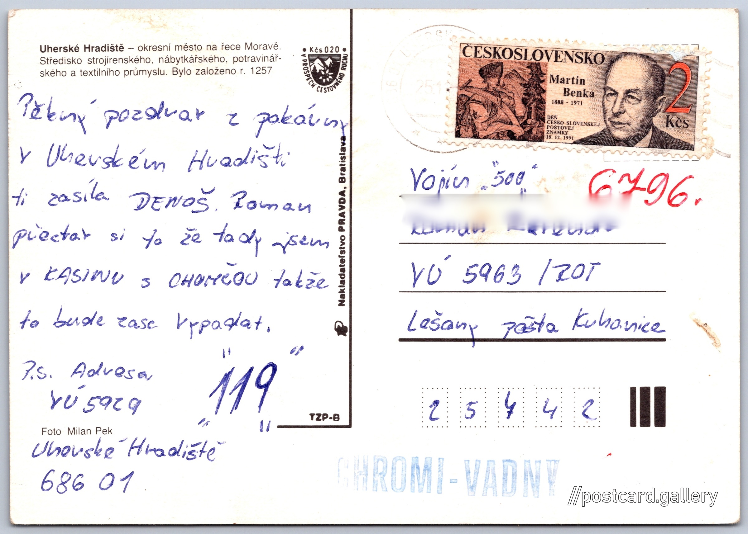 Uherské Hradiště Pokud chcete vidět pohlednice ve vyšším rozlišení nebo zobrazovat jejich zadní stranu, tak se prosím nejdříve přihlašte Přihlásit Zaregistrovat Uherské Hradiště Uherské Hradiště - okresní město na řece Moravě. Středisko strojírenského, nábytkářského, potravinářského a textilního průmyslu. Bylo založeno r. 1257 Jazyk tištěného textu na pohlednici: čeština Masarykovo náměstí, Uherské Hradiště, Uherské Hradiště ukázat na mapě Vydavatel: Nakladateľstvo PRAVDA, Bratislava (Československo) Datum vydání není známo Pomozte nám odhadnout datum vzniku pohlednice Velikost (š x v) a tvar pohlednice: 138 x 105 mm (5.43" x 4.13"), obdélník Osoby spjaté s touto pohlednicí: Milan Pék(Autor fotografie) Prošlá poštou Ceny: Příplatek na tur. ruch: 0,20 Kčs (CSK))Vyplacené známky: 2,00 Kčs (CSK) DiskuseVložit příspěvek Přidat novou složku ... Spravovat složky ...