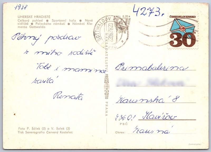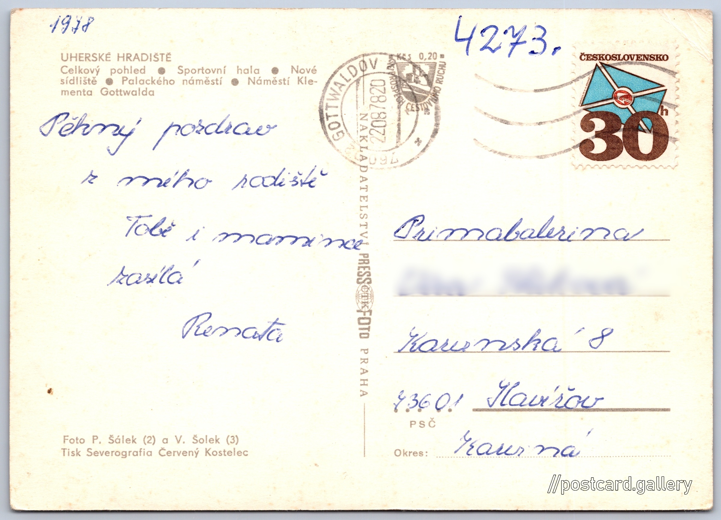 Uherské Hradiště Pokud chcete vidět pohlednice ve vyšším rozlišení nebo zobrazovat jejich zadní stranu, tak se prosím nejdříve přihlašte Přihlásit Zaregistrovat Uherské Hradiště UHERSKÉ HRADIŠTĚ- Celkový pohled- Sportovní hala- Nové sídliště- Palackého náměstí- Náměstí Klementa Gottwalda Jazyk tištěného textu na pohlednici: čeština Uherské Hradiště, Město, Česko ukázat na mapě Vydavatel: PressFoto Praha (Československo) Odhadované datum vydání pohlednice: 1975 - 1978 Pomozte nám zpřesnit rok vzniku pohlednice Velikost (š x v) a tvar pohlednice: 148 x 106 mm (5.83" x 4.17"), obdélník Osoby spjaté s touto pohlednicí: Petr Šálek(Autor fotografie) Vítězslav Šolek(Autor fotografie) Prošlá poštou:Datum na razítku: 22.8.1978 Ceny: Příplatek na tur. ruch: 0,20 Kčs (CSK))Vyplacené známky: 0,30 Kčs (CSK) DiskuseVložit příspěvek Přidat novou složku ... Spravovat složky ...