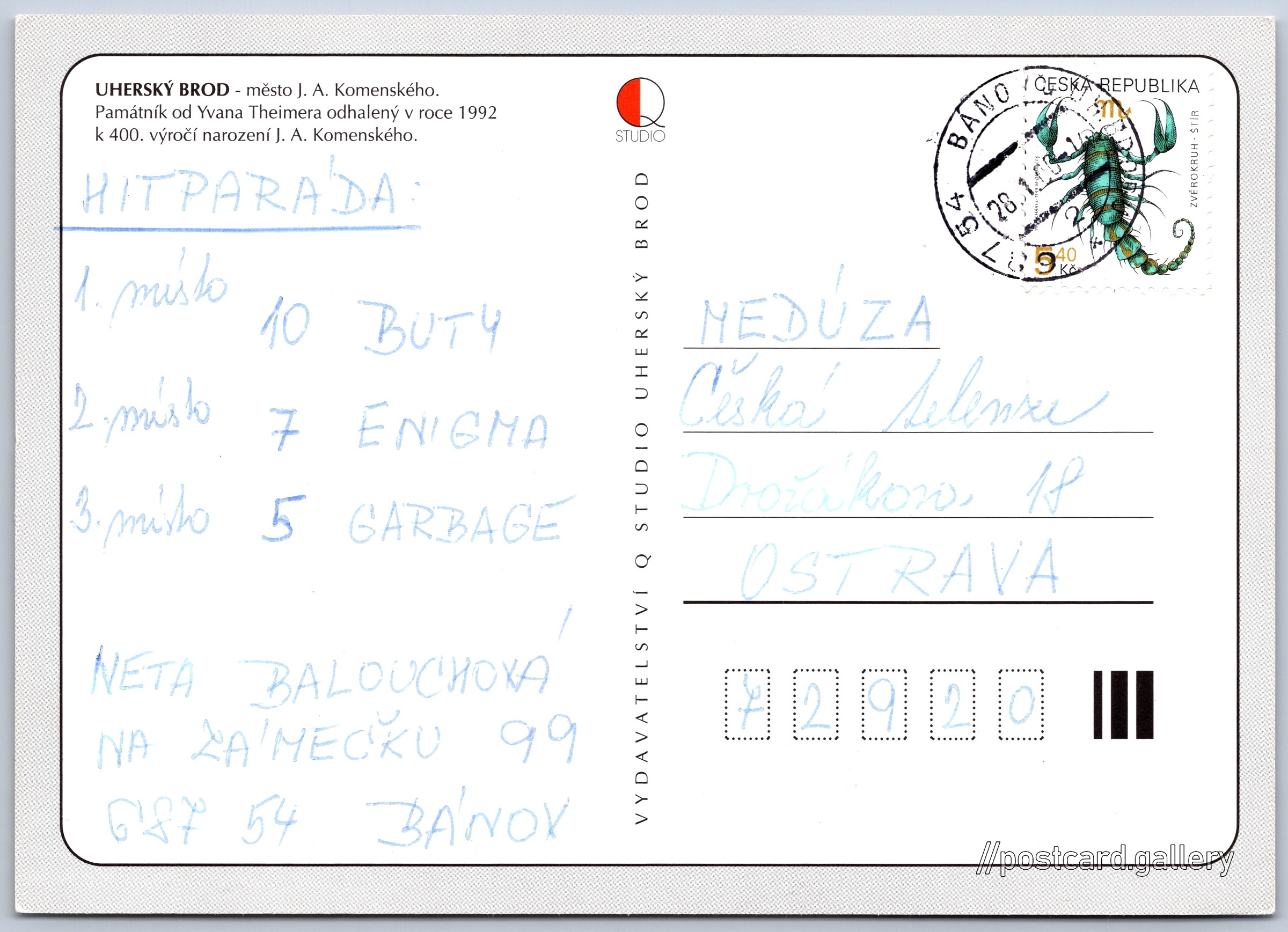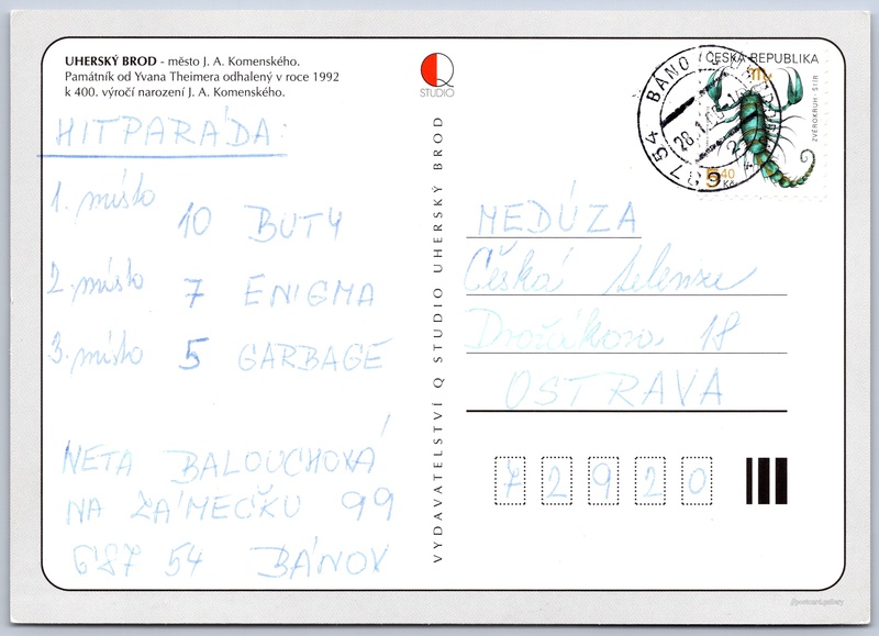 Uherský Brod Pokud chcete vidět pohlednice ve vyšším rozlišení nebo zobrazovat jejich zadní stranu, tak se prosím nejdříve přihlašte Přihlásit Zaregistrovat Uherský Brod UHERSKÝ BROD - město J. A. Komenského.Památník od Yvana Theimera odhalený v roce 1992 k 400. výročí narození J. A. Komenského. Jazyk tištěného textu na pohlednici: čeština Masarykovo nám., Uherský Brod, Uherské Hradiště ukázat na mapě V blízkém okolí místa zobrazeného na pohlednici lze najít 3 jiné pohlednice. Zobrazit blízké pohlednice Odhadované datum vydání pohlednice: 1997 - 2000 Pomozte nám zpřesnit rok vzniku pohlednice Velikost (š x v) a tvar pohlednice: 147 x 105 mm (5.79" x 4.13"), obdélník Osoby spjaté s touto pohlednicí: Jan Amos Komenský(Obsah pohlednice) Ivan Theimer(Obsah pohlednice) Prošlá poštou:Datum na razítku: 28.1.2000 Ceny: Vyplacené známky: 5,40 Kč (CZK) DiskuseVložit příspěvek Přidat novou složku ... Spravovat složky ...