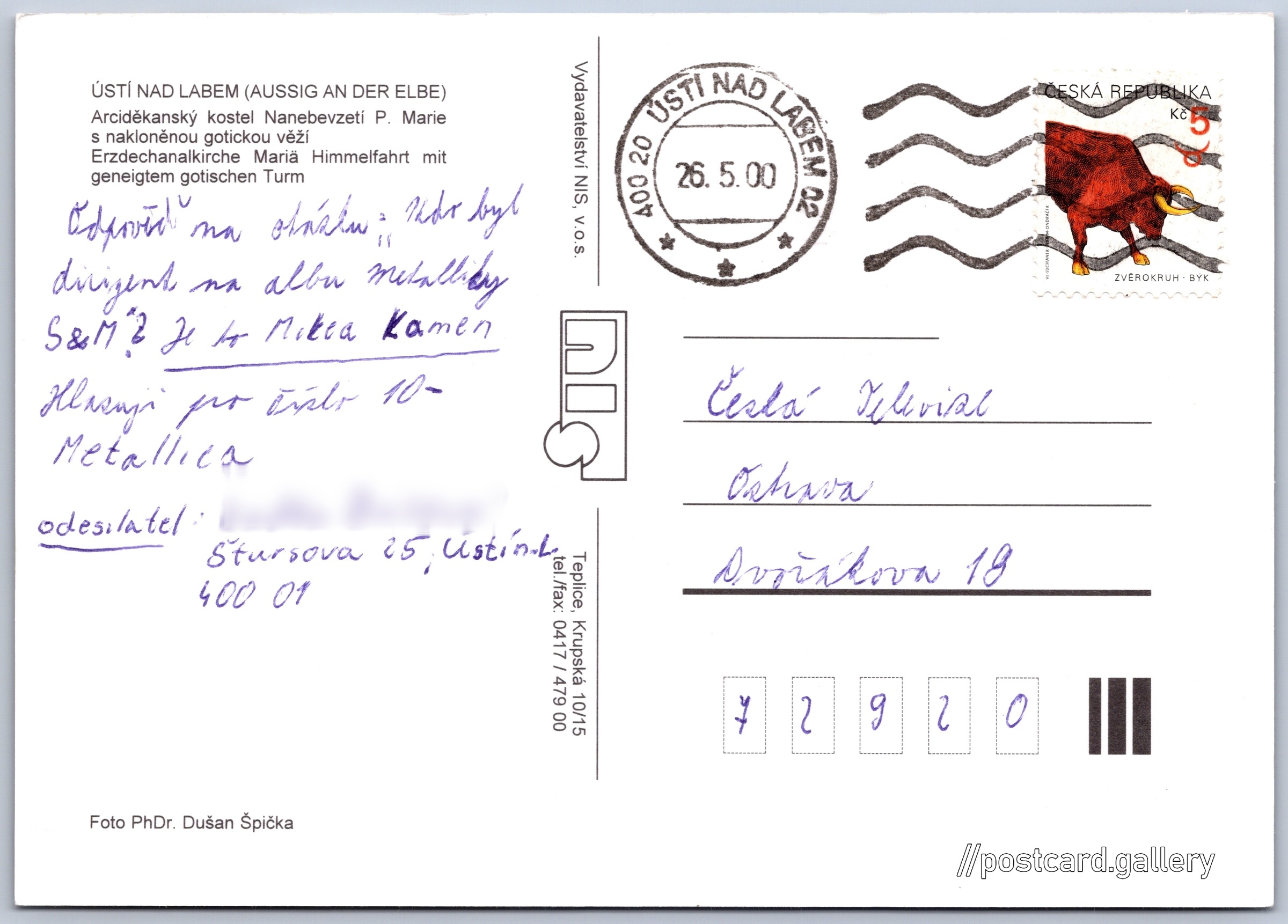 Ústí na Labem, kostel Nanebevzetí P. Marie Pokud chcete vidět pohlednice ve vyšším rozlišení nebo zobrazovat jejich zadní stranu, tak se prosím nejdříve přihlašte Přihlásit Zaregistrovat Ústí na Labem ÚSTÍ NAD LABEM (AUSSIG AN DER ELBE)- Arciděkanský kostel Nanebevzetí P. Marie s nakloněnou gotickou věží- Erzdechanalkirche Mariä Himmelfahrt mit geneigtem gotischen Turm Jazyky tištěného textu na pohlednici: čeština, němčina Bílinská, Ústí nad Labem, Ústí nad Labem ukázat na mapě V blízkém okolí místa zobrazeného na pohlednici lze najít 6 jiných pohlednic. Zobrazit blízké pohlednice Vydavatel: Vydavatelství NIS, v.o.s. (Česko) Odhadované datum vydání pohlednice: 1997 - 2000 Pomozte nám zpřesnit rok vzniku pohlednice Velikost (š x v) a tvar pohlednice: 147 x 104 mm (5.79" x 4.09"), obdélník Osoby spjaté s touto pohlednicí: PhDr. Dušan Špička(Autor fotografie) Prošlá poštou:Datum na razítku: 26.5.2000 Ceny: Vyplacené známky: 5,00 Kč (CZK) DiskuseVložit příspěvek Přidat novou složku ... Spravovat složky ...