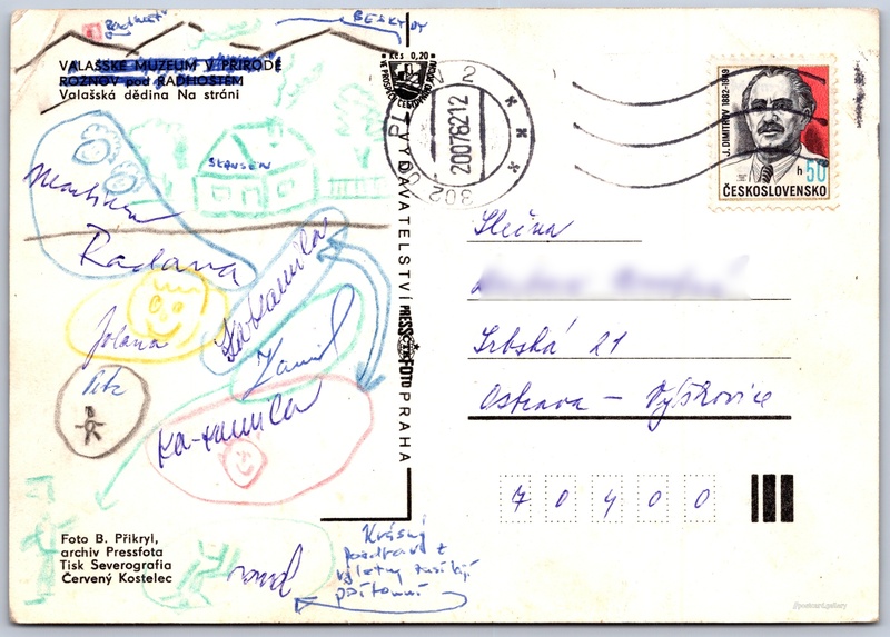 Valašské muzeum v přírodě Pokud chcete vidět pohlednice ve vyšším rozlišení nebo zobrazovat jejich zadní stranu, tak se prosím nejdříve přihlašte Přihlásit Zaregistrovat Rožnov pod RadhoštěmValašské muzeum v přírodě VALAŠSKÉ MUZEUM V PRIRODEROŽNOV pod RADHOŠTĚMValašská dědina Na stráni Jazyk tištěného textu na pohlednici: čeština Sluneční 2370, 756 61 Rožnov pod Radhoštěm, Czechia ukázat na mapě Vydavatel: PressFoto Praha (Československo) Odhadované datum vydání pohlednice: 1979 - 1982 Pomozte nám zpřesnit rok vzniku pohlednice Velikost (š x v) a tvar pohlednice: 148 x 105 mm (5.83" x 4.13"), obdélník Osoby spjaté s touto pohlednicí: B. Přikryl(Autor fotografie) Prošlá poštou:Datum na razítku: 20.7.1982 Ceny: Příplatek na tur. ruch: 0,20 Kčs (CSK))Vyplacené známky: 0,50 Kčs (CSK) DiskuseVložit příspěvek Přidat novou složku ... Spravovat složky ...