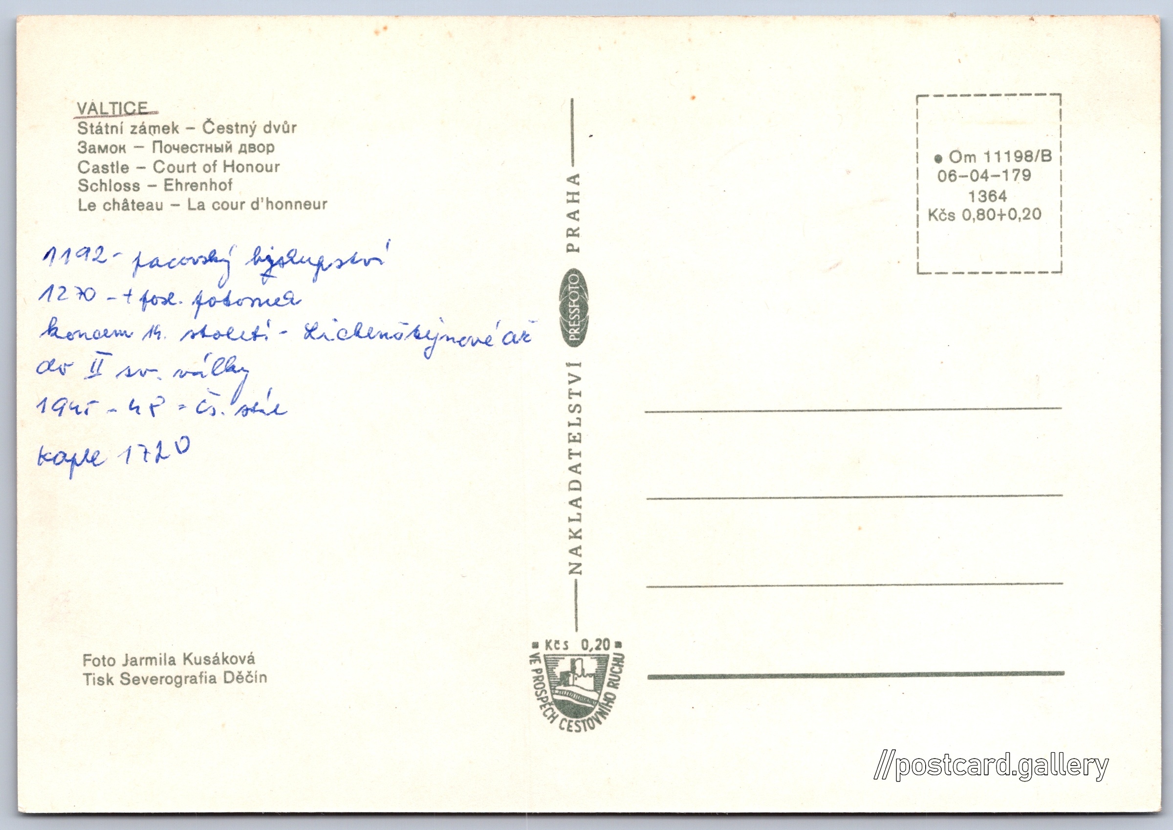 Valtice, zámek Pokud chcete vidět pohlednice ve vyšším rozlišení nebo zobrazovat jejich zadní stranu, tak se prosím nejdříve přihlašte Přihlásit Zaregistrovat VALTICE- Státní zámek - Čestný dvůr- Замок - Почестный двор- Castle - Court of Honour- Schloss - Ehrenhof- Le château - La cour d'honneur Jazyk tištěného textu na pohlednici: čeština Valtice, Břeclav ukázat na mapě V blízkém okolí místa zobrazeného na pohlednici lze najít 4 jiné pohlednice. Zobrazit blízké pohlednice Vydavatel: PressFoto Praha (Československo) Rok vydání pohlednice: 1971 Velikost (š x v) a tvar pohlednice: 149 x 103 mm (5.87" x 4.06"), obdélník Osoby spjaté s touto pohlednicí: Jarmila Kusáková(Autor fotografie) Čistá pohlednice (neprošlá poštou) Ceny: Cena pohlednice: 0,80 Kčs (CSK) (+0,20 Kčs přípl. na tur. ruch) Kódy na pohlednici: •Om 11198/B 06-04-179 1364 DiskuseVložit příspěvek Přidat novou složku ... Spravovat složky ...