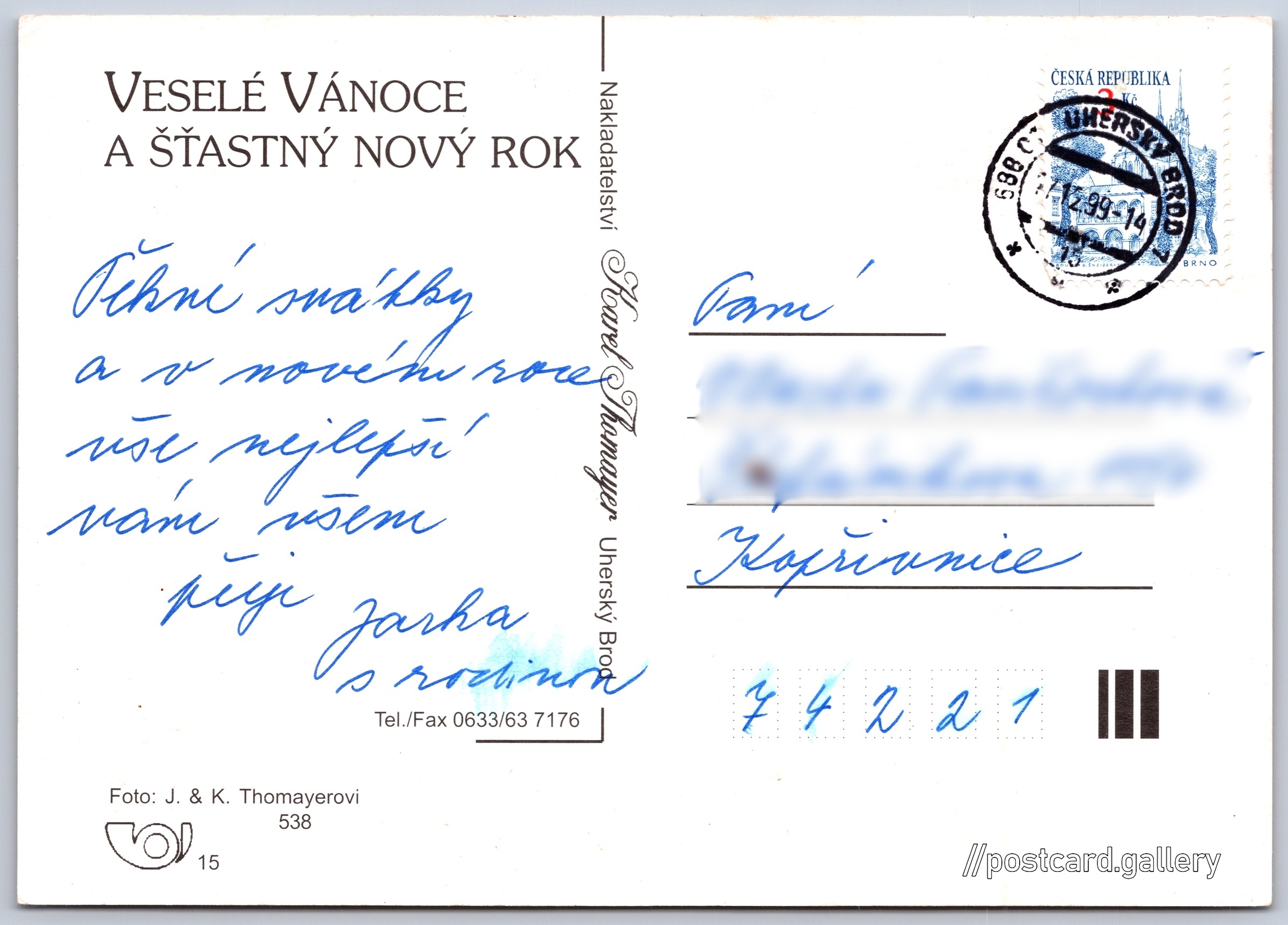 Vánoční a novoroční pohlednice Pokud chcete vidět pohlednice ve vyšším rozlišení nebo zobrazovat jejich zadní stranu, tak se prosím nejdříve přihlašte Přihlásit Zaregistrovat VESELÉ VÁNOCE A ŠŤASTNÝ NOVÝ ROK Jazyk tištěného textu na pohlednici: čeština Vydavatel: Nakladatelství Thomayer (Československo) Odhadované datum vydání pohlednice: 1996 - 1999 Pomozte nám zpřesnit rok vzniku pohlednice Velikost (š x v) a tvar pohlednice: 148 x 105 mm (5.83" x 4.13"), obdélník Osoby spjaté s touto pohlednicí: Karel Thomayer(Autor fotografie) J. Thomayer(Autor fotografie) Prošlá poštou:Datum na razítku: 17.12.1999 Ceny: Vyplacené známky: 3,00 Kč (CZK) Kódy na pohlednici: 538 DiskuseVložit příspěvek Přidat novou složku ... Spravovat složky ...