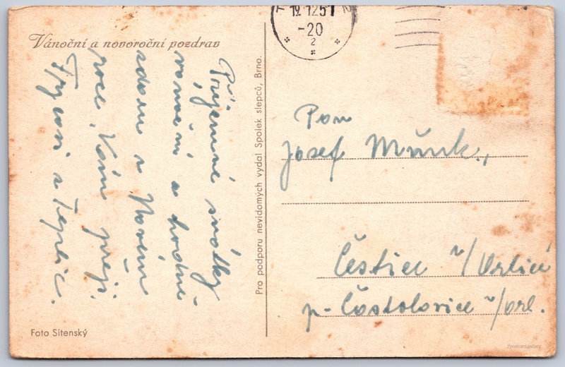 Vánoční a novoroční pozdrav Pokud chcete vidět pohlednice ve vyšším rozlišení nebo zobrazovat jejich zadní stranu, tak se prosím nejdříve přihlašte Přihlásit Zaregistrovat Vánoční a novoroční pozdravPro podporu nevidomých vydal Spolek slepců, Brno. Jazyk tištěného textu na pohlednici: čeština Vydavatel: Spolek slepců, Brno (Československo) Odhadované datum vydání pohlednice: 1948 - 1951 Pomozte nám zpřesnit rok vzniku pohlednice Velikost (š x v) a tvar pohlednice: 139 x 90 mm (5.47" x 3.54"), obdélník Osoby spjaté s touto pohlednicí: Daniel Sitenský(Autor fotografie) Prošlá poštou:Datum na razítku: 19.12.1951 DiskuseVložit příspěvek Přidat novou složku ... Spravovat složky ...