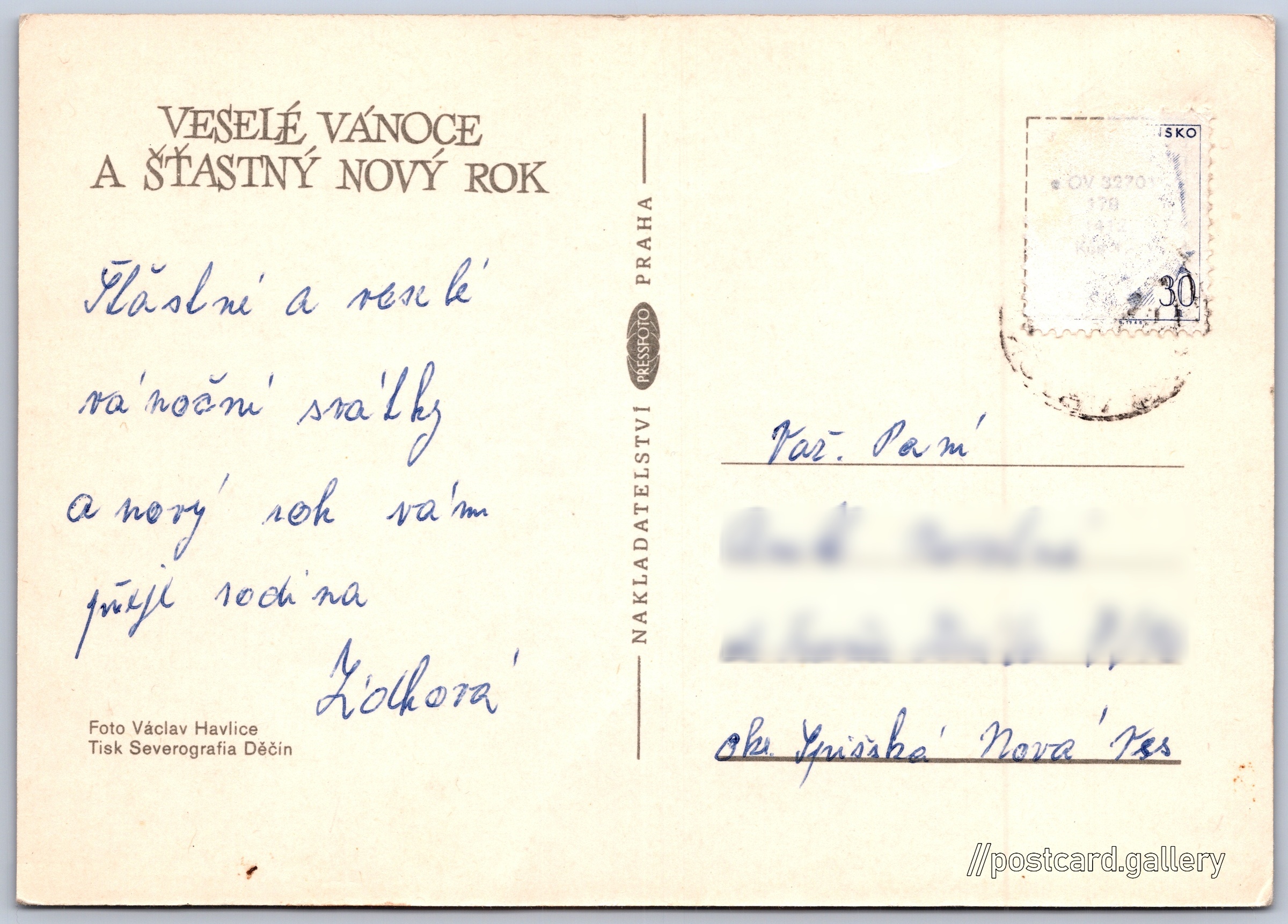 Vánoční a novoroční přání, hodiny Pokud chcete vidět pohlednice ve vyšším rozlišení nebo zobrazovat jejich zadní stranu, tak se prosím nejdříve přihlašte Přihlásit Zaregistrovat VESELÉ VÁNOCE A ŠŤASTNÝ NOVÝ ROK Jazyk tištěného textu na pohlednici: čeština Vydavatel: PressFoto Praha (Československo) Rok vydání pohlednice: 1971 Velikost (š x v) a tvar pohlednice: 148 x 105 mm (5.83" x 4.13"), obdélník Osoby spjaté s touto pohlednicí: Václav Havlice(Autor fotografie) Prošlá poštou DiskuseVložit příspěvek Přidat novou složku ... Spravovat složky ...